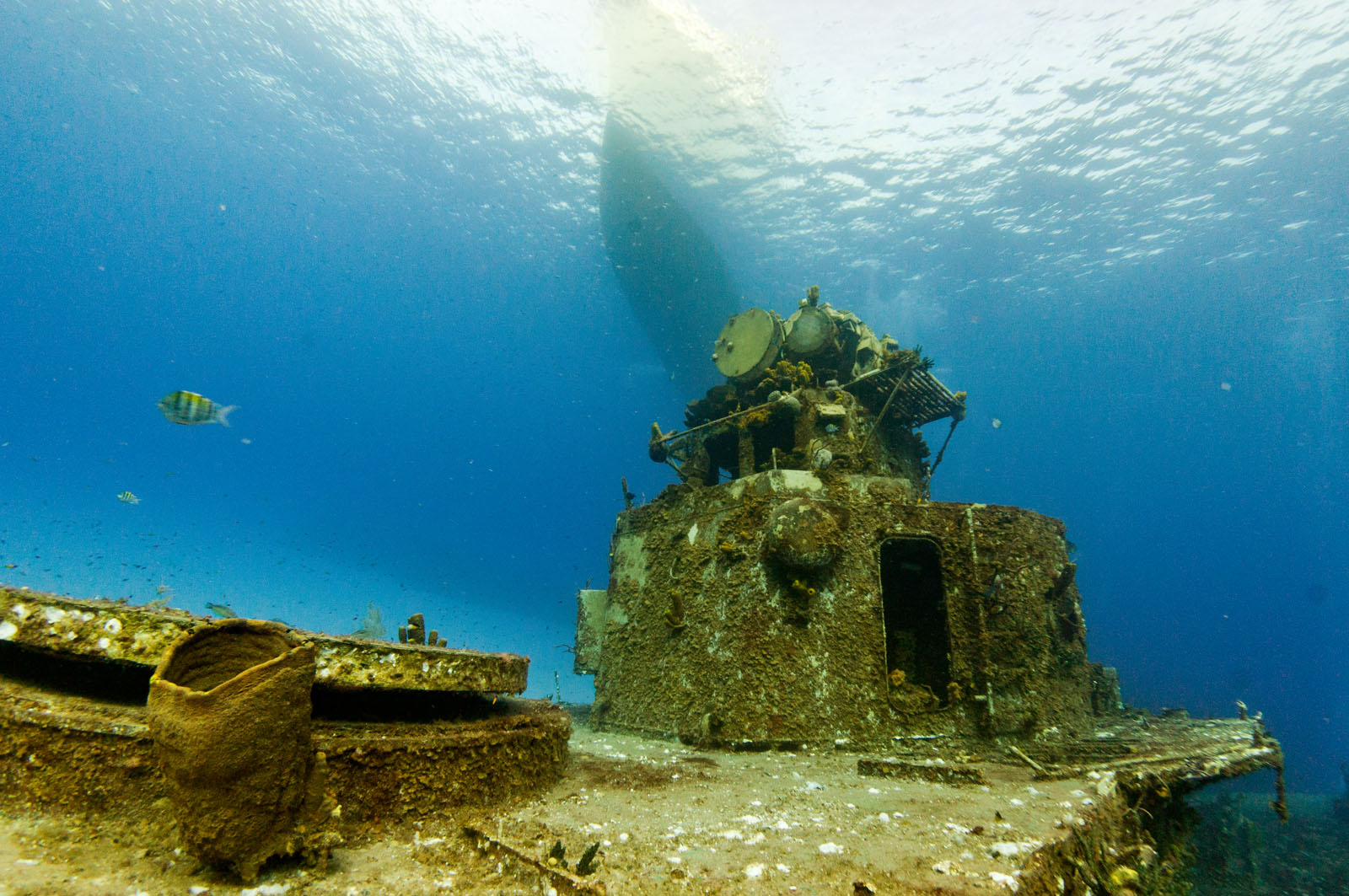 The great warship settled upright on a white-sand bottom close to East Chute, one of the Brac’s best drop-offs. She is pointed toward the open sea and there is a vertical wall some 200 feet off the bow.