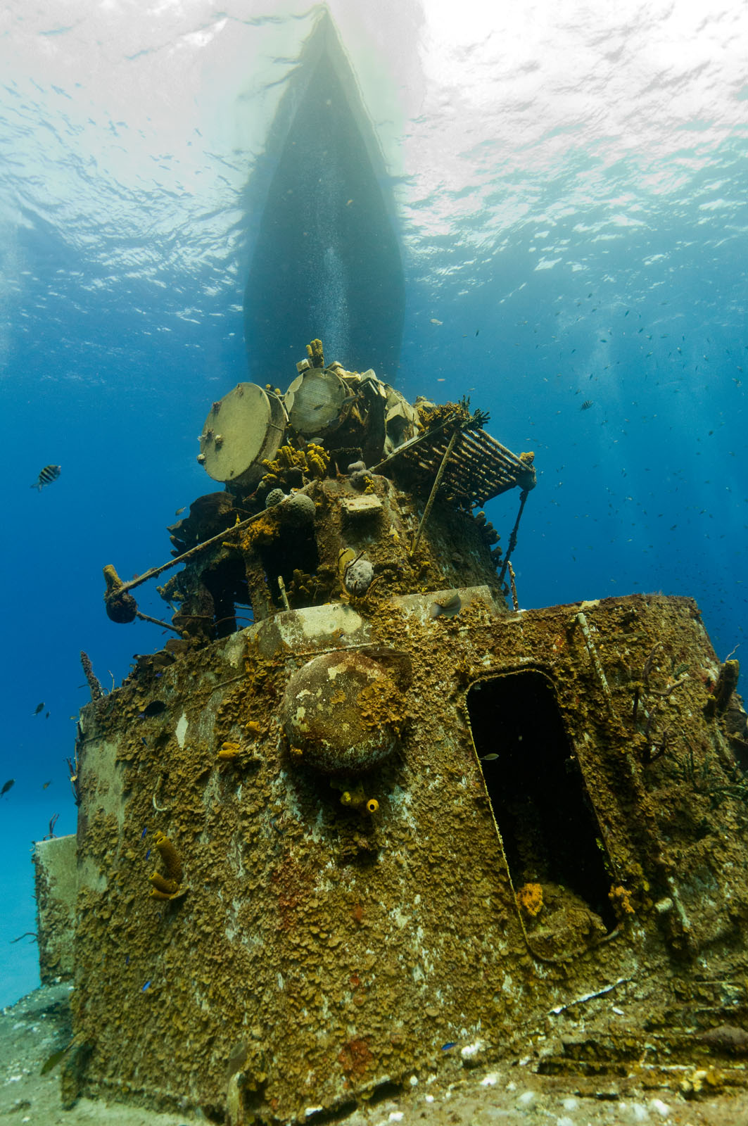 The great warship settled upright on a white-sand bottom close to East Chute, one of the Brac’s best drop-offs. She is pointed toward the open sea and there is a vertical wall some 200 feet off the bow.