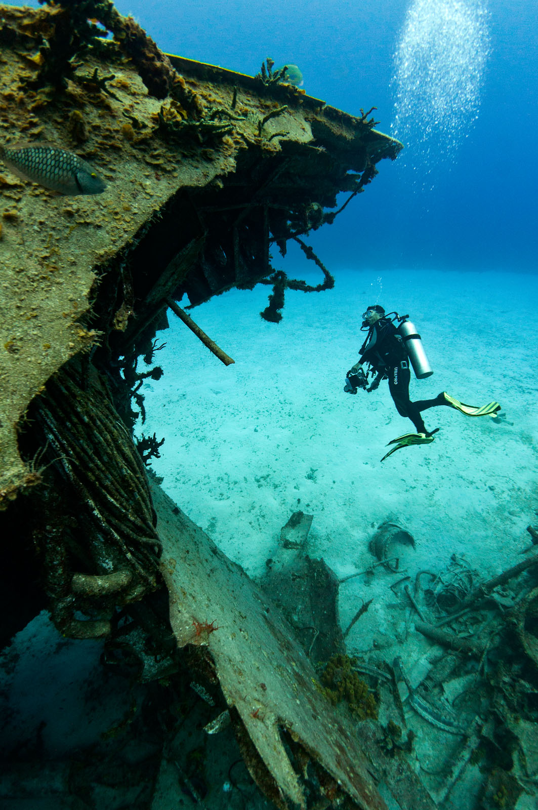 The great warship settled upright on a white-sand bottom close to East Chute, one of the Brac’s best drop-offs. She is pointed toward the open sea and there is a vertical wall some 200 feet off the bow.