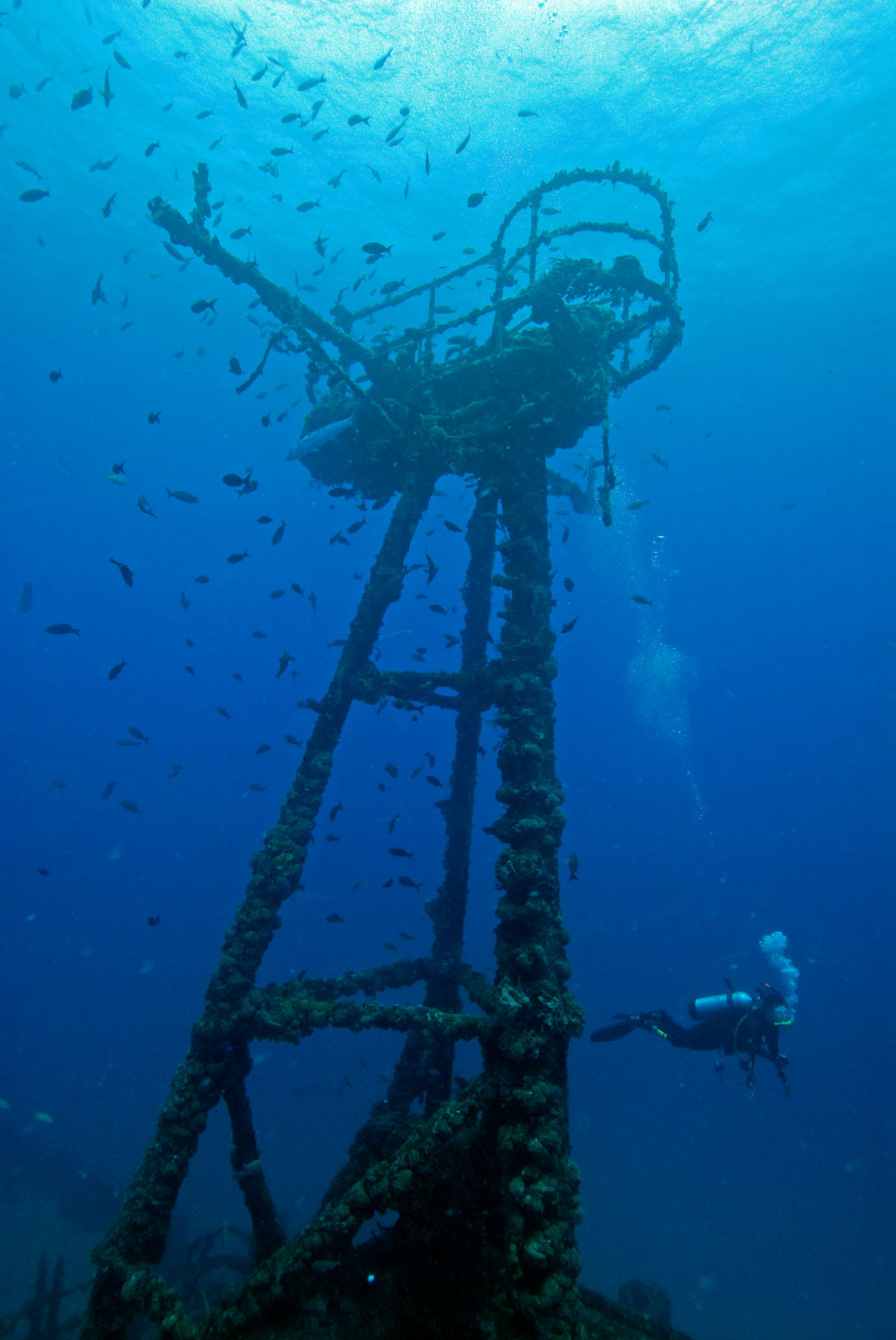 The crow's nest on the USCG Cutter Duane, sunk as an artificial reef off the coast of Key Largo, Florida, USA. The Duane was intentionally sunk as an artificial reef on November 27, 1987. She came to rest upright on the sandy bottom in approximately 130' of water, about a mile south of Molasses Reef. She was commissioned on 8/1/36, is 327 feet long with a beam of 41'.