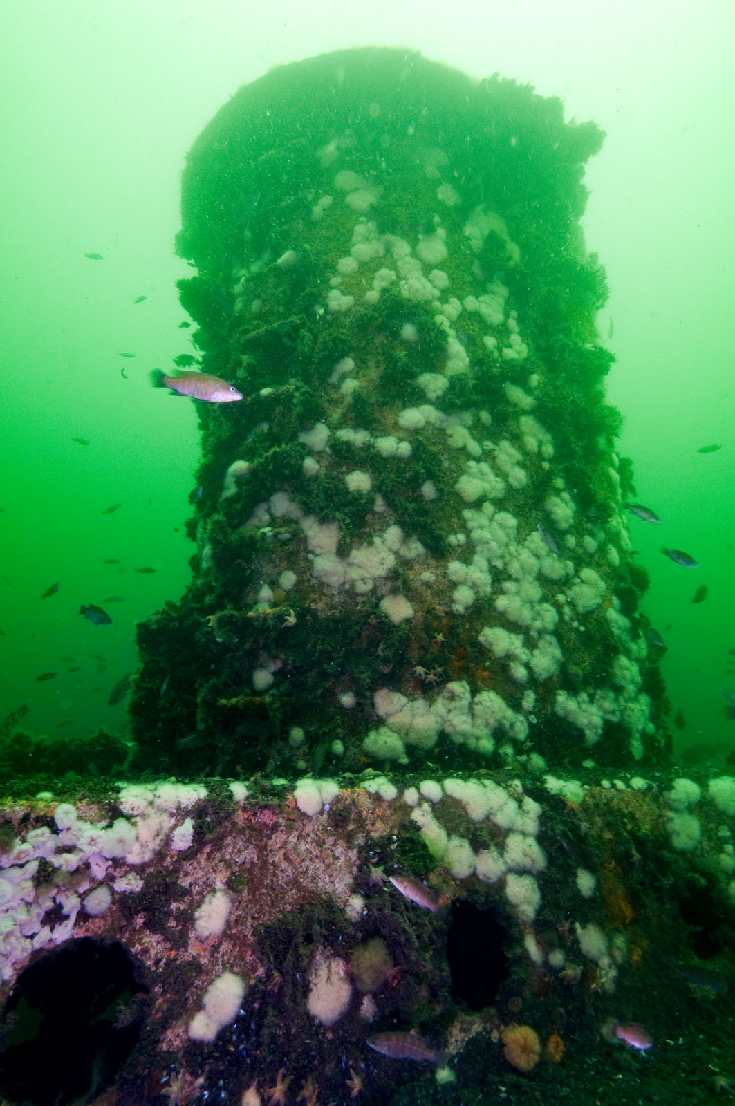 The smoke stack on the tugboat G. A. Venturo on the Sea Girt Artificial Reef off Sea Girt, New Jersey, USA. The tugboat was a US Navy tug that was sunk on Thursday, October 17, 1996. She was sponsored by Sean Maubray & FCO. The site was later named in memory of Greg Venturo, a local SCUBA diver that died while diving. She lies in 80' of water.