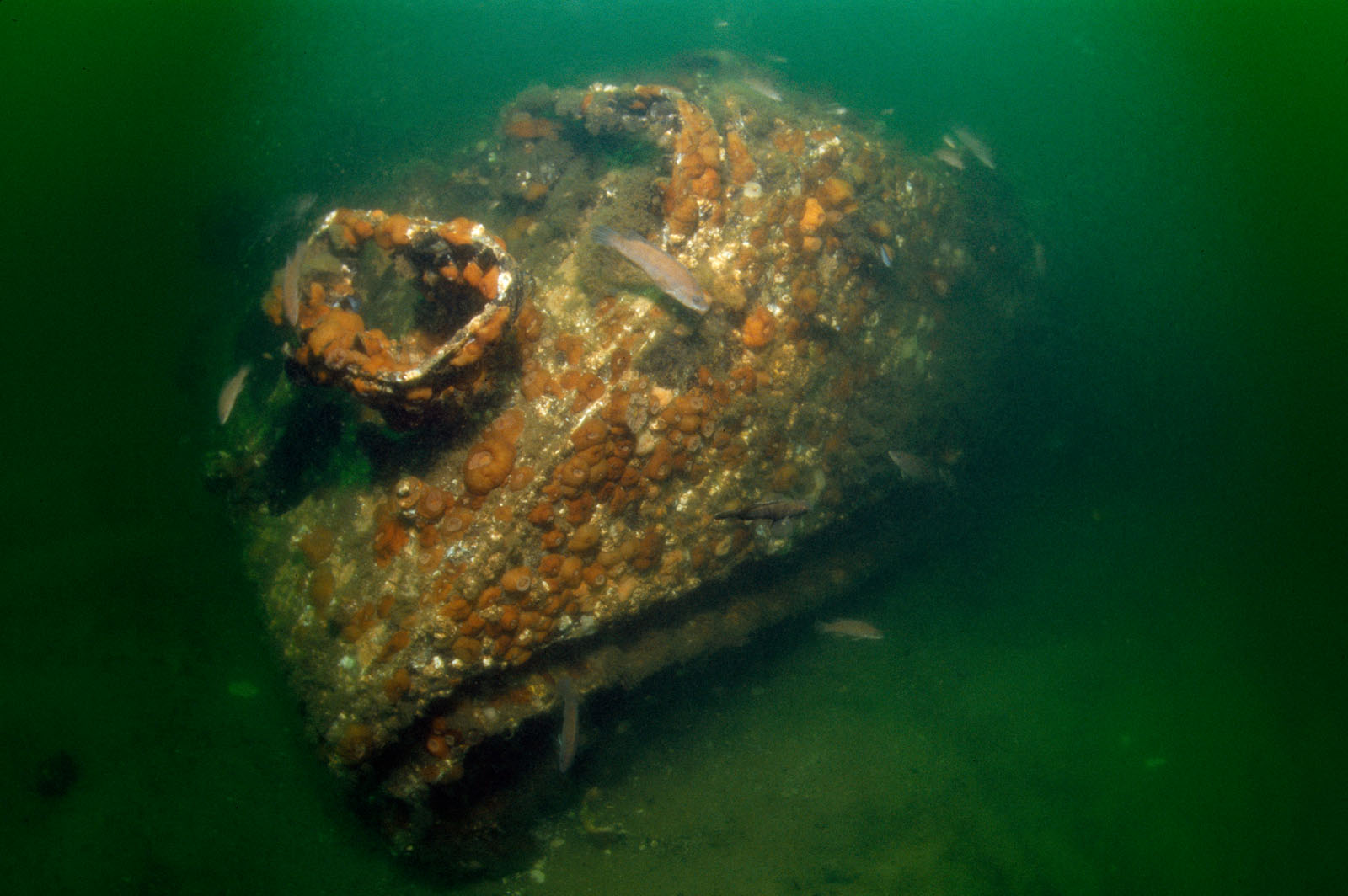 A M113 armored personnel carrier (APC) on the Sea Girt Reef in 60' of water in the Atlantic Ocean off Sea Girt, New Jersey, USA. Each M113 had a crew of two, a commander and a driver, and could carry eleven men and their equipment. The driver sat on the L/H side of the vehicle, and had a good field of vision through four periscopes wich were mounted in the cupola. The commander was situated centrally in the vehicle and had a fully rotating cupola with five periscopes. The commander also acted as the gunner and operated the .50 cal machine gun, this could be rotated through a full 360 degrees to give an all-round field of fire if needed. The ammo for the 50 was stored in portable boxes behind the infantrymen's seats.