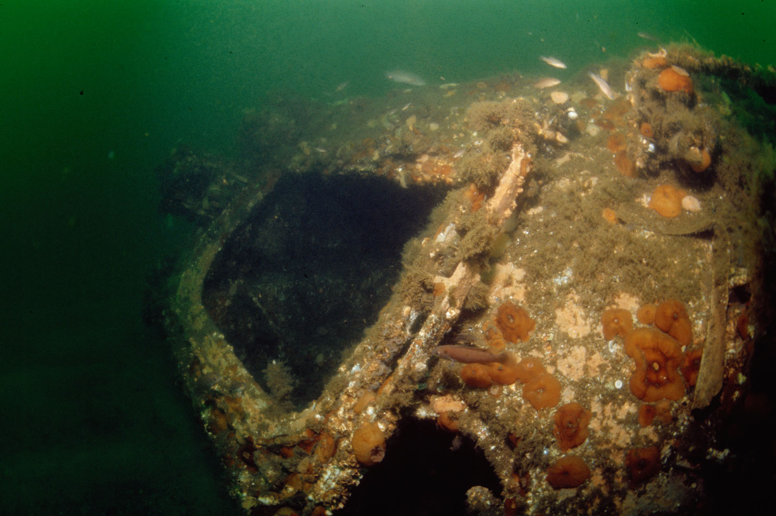 A M113 armored personnel carrier (APC) on the Sea Girt Reef in 60' of water in the Atlantic Ocean off Sea Girt, New Jersey, USA. Each M113 had a crew of two, a commander and a driver, and could carry eleven men and their equipment. The driver sat on the L/H side of the vehicle, and had a good field of vision through four periscopes wich were mounted in the cupola. The commander was situated centrally in the vehicle and had a fully rotating cupola with five periscopes. The commander also acted as the gunner and operated the .50 cal machine gun, this could be rotated through a full 360 degrees to give an all-round field of fire if needed. The ammo for the 50 was stored in portable boxes behind the infantrymen's seats.