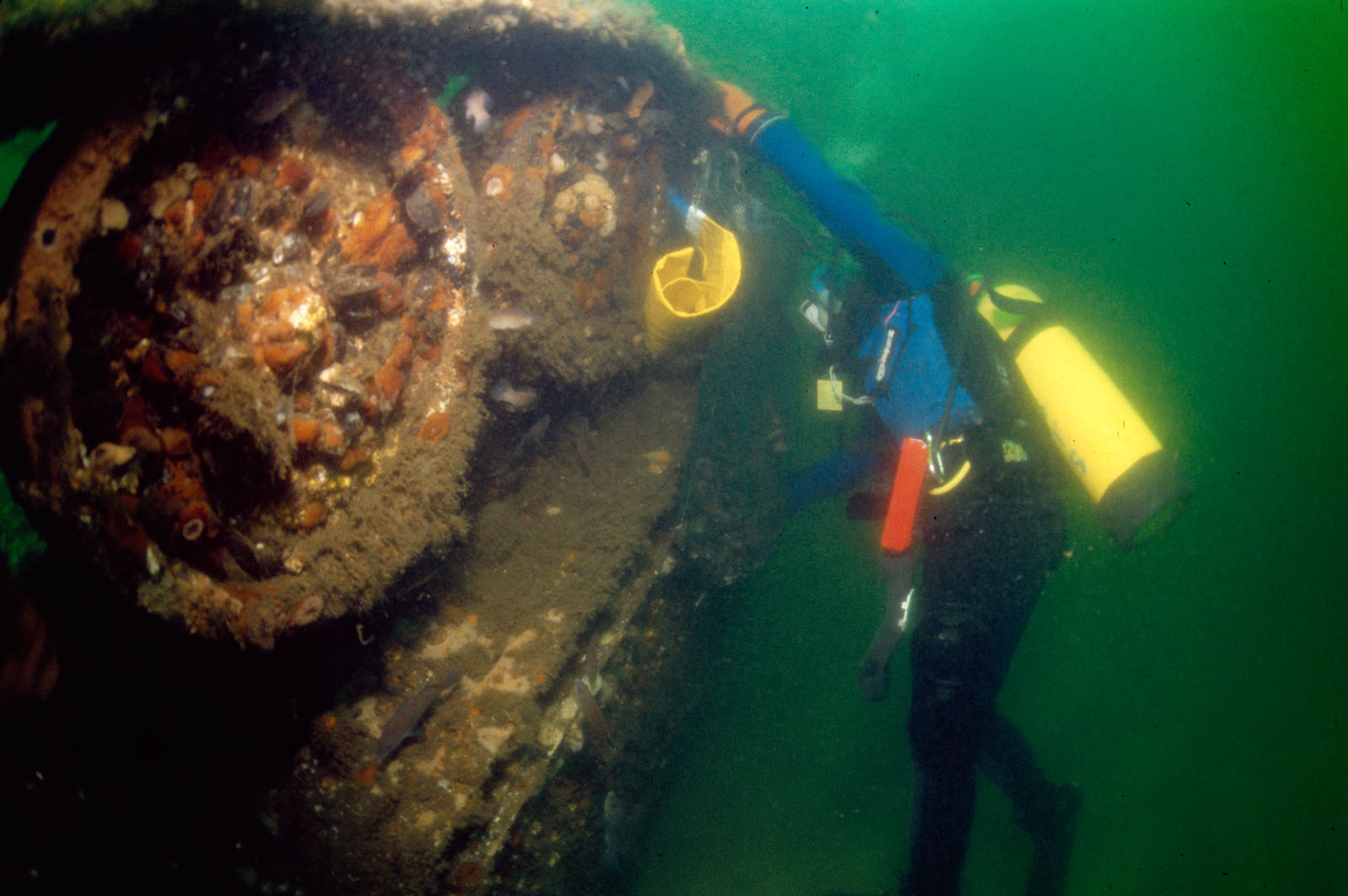 Beth Dalzell of Brick, NJ, gathers blue mussels, Mylilus edulis, from an M113 armored personnel carrier (APC) on the Sea Girt Reef in 60' of water in the Atlantic Ocean off Sea Girt, New Jersey, USA. Each M113 had a crew of two, a commander and a driver, and could carry eleven men and their equipment. The driver sat on the L/H side of the vehicle, and had a good field of vision through four periscopes wich were mounted in the cupola. The commander was situated centrally in the vehicle and had a fully rotating cupola with five periscopes. The commander also acted as the gunner and operated the .50 cal machine gun, this could be rotated through a full 360 degrees to give an all-round field of fire if needed. The ammo for the 50 was stored in portable boxes behind the infantrymen's seats.
