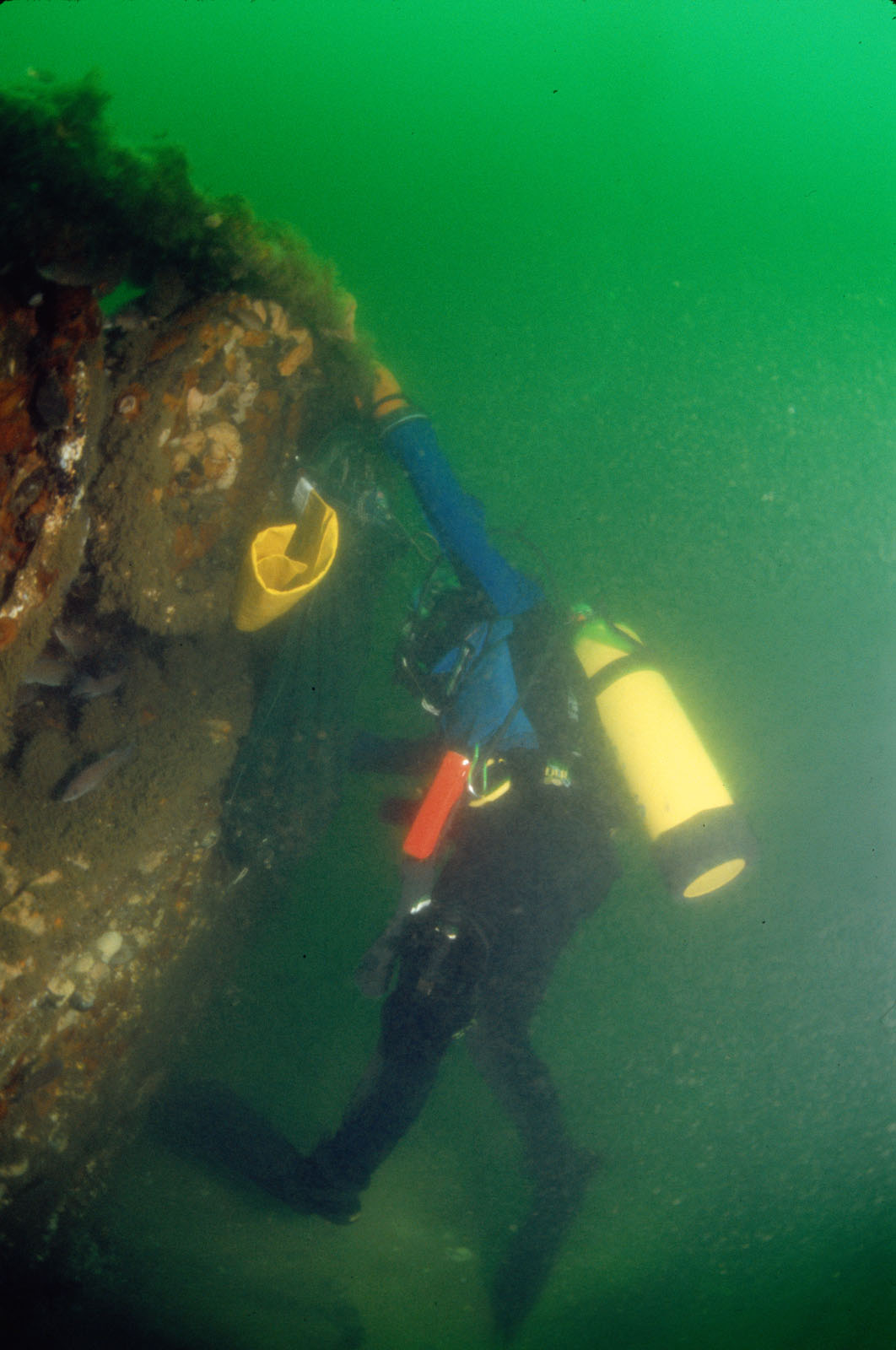 Beth Dalzell of Brick, NJ, gathers blue mussels, Mylilus edulis, from an M113 armored personnel carrier (APC) on the Sea Girt Reef in 60' of water in the Atlantic Ocean off Sea Girt, New Jersey, USA. Each M113 had a crew of two, a commander and a driver, and could carry eleven men and their equipment. The driver sat on the L/H side of the vehicle, and had a good field of vision through four periscopes wich were mounted in the cupola. The commander was situated centrally in the vehicle and had a fully rotating cupola with five periscopes. The commander also acted as the gunner and operated the .50 cal machine gun, this could be rotated through a full 360 degrees to give an all-round field of fire if needed. The ammo for the 50 was stored in portable boxes behind the infantrymen's seats.