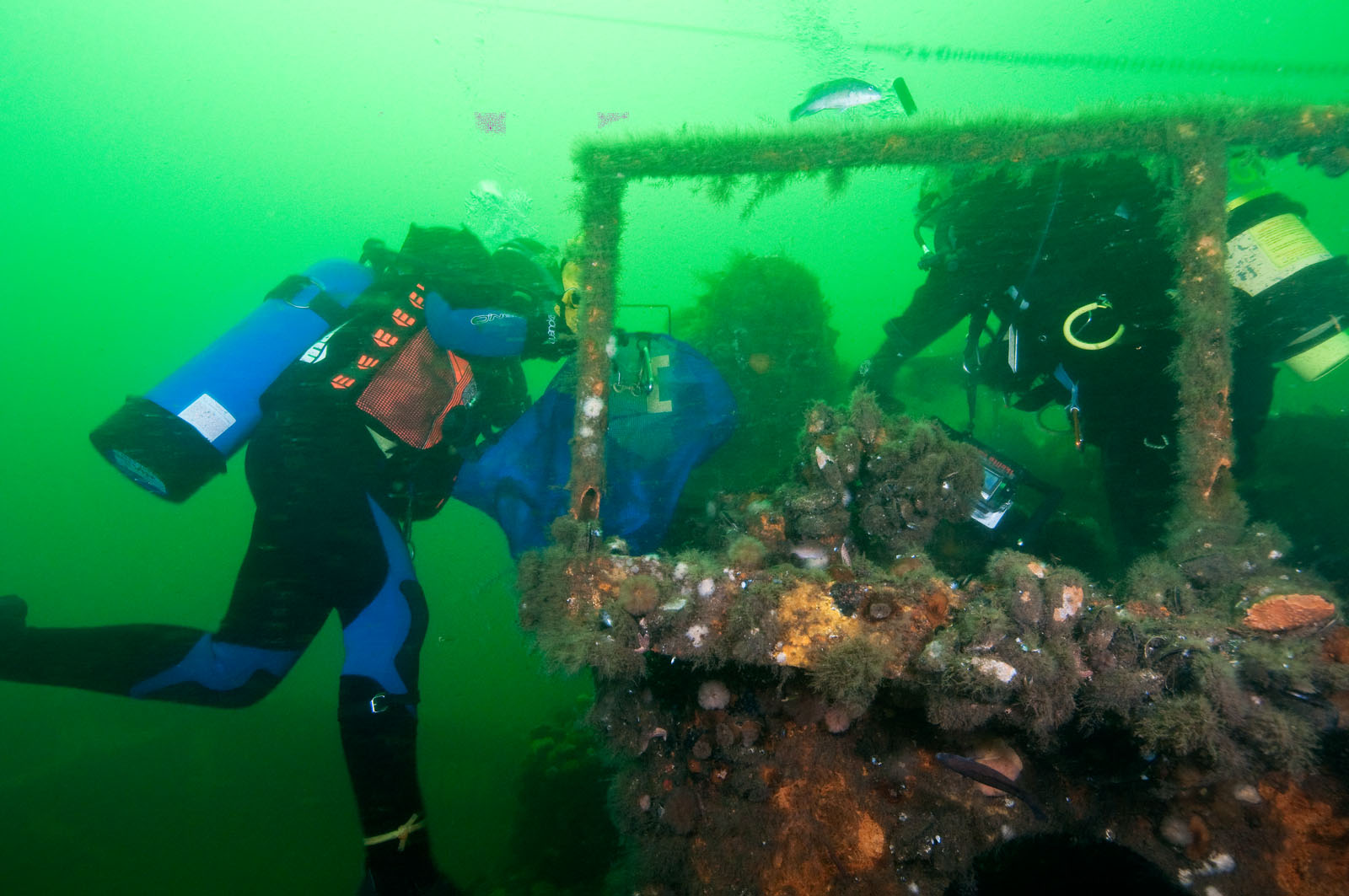 Jennit Ward (left) of Santa Cruz, CA and her mom, Beth Dalzell of Brick, New Jersey collect blue mussels from the top of the deck house on the McGurr tugboat, sunk on Tuesday, September 12, 2000. The tug is 85' long and was built in 1951 in Cohoes, NY and named the Edward Matton. She was also called the Patrick McHugh. The tug was sponsored by Ocean Wreck Divers in memory of Charles J. McGurr, Jr. She lies in 80' of water on the Axel Carlson Reef in New Jersey, USA. This canal tugboat has a pilot house that could be raised or lowered.