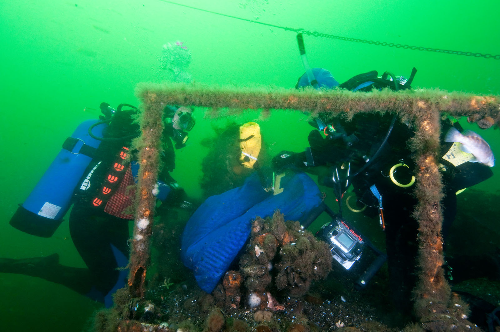 Jennit Ward (left) of Santa Cruz, CA and her mom, Beth Dalzell of Brick, New Jersey collect blue mussels from the top of the deck house on the McGurr tugboat, sunk on Tuesday, September 12, 2000. The tug is 85' long and was built in 1951 in Cohoes, NY and named the Edward Matton. She was also called the Patrick McHugh. The tug was sponsored by Ocean Wreck Divers in memory of Charles J. McGurr, Jr. She lies in 80' of water on the Axel Carlson Reef in New Jersey, USA. This canal tugboat has a pilot house that could be raised or lowered.