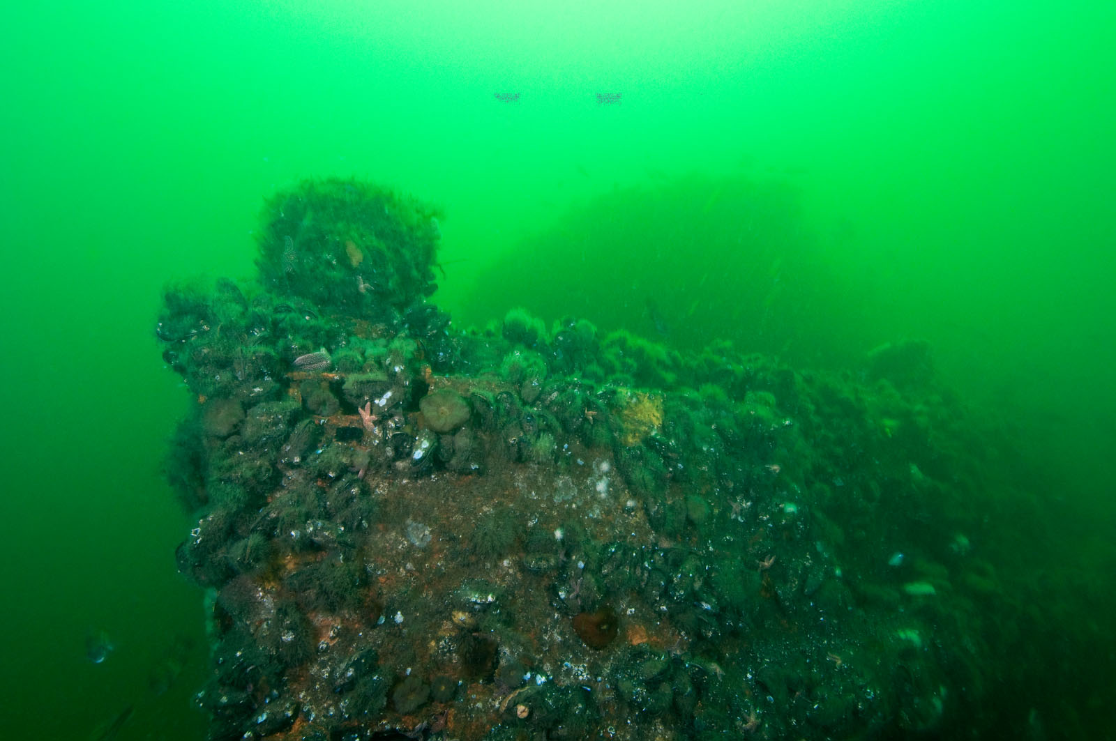The blue mussel covered bow of the McGurr tugboat, sunk on Tuesday, September 12, 2000. The tug is 85' long and was built in 1951 in Cohoes, NY and named the Edward Matton. She was also called the Patrick McHugh. The tug was sponsored by Ocean Wreck Divers in memory of Charles J. McGurr, Jr. She lies in 80' of water on the Axel Carlson Reef in New Jersey, USA. This canal tugboat has a pilot house that could be raised or lowered.