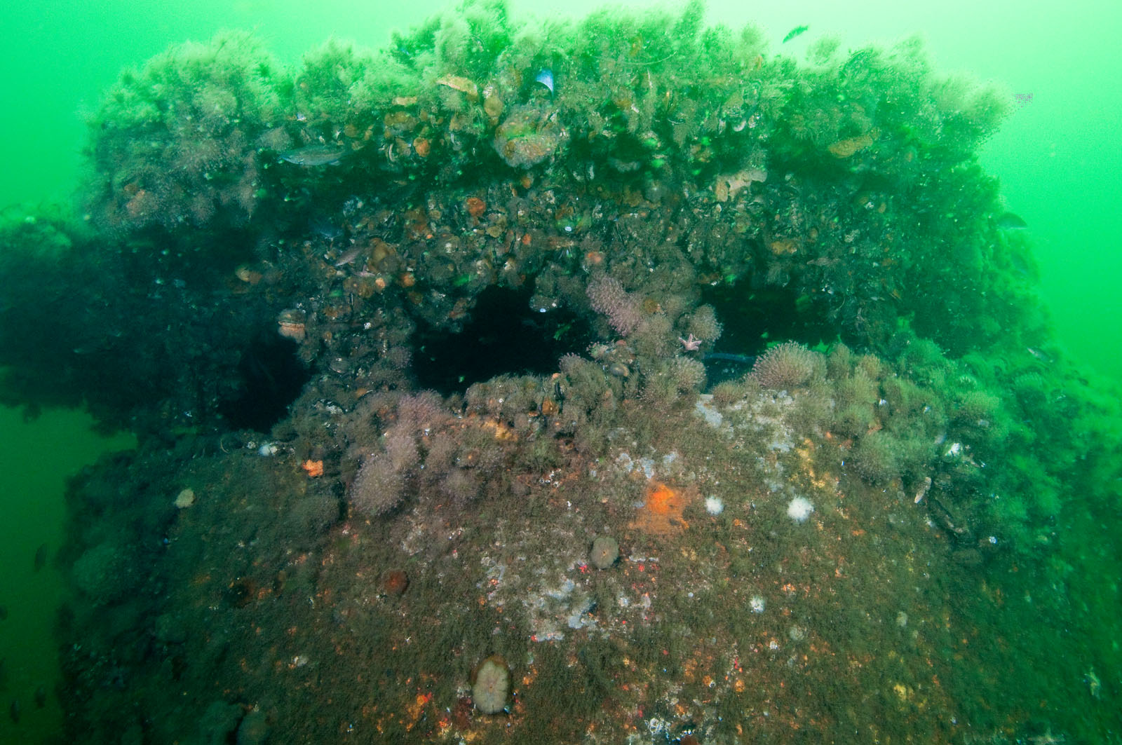 Blue mussels, tubularian hydroids and frilled anemones cover the pilot house on the McGurr tugboat, sunk on Tuesday, September 12, 2000. The tug is 85' long and was built in 1951 in Cohoes, NY and named the Edward Matton. She was also called the Patrick McHugh. The tug was sponsored by Ocean Wreck Divers in memory of Charles J. McGurr, Jr. She lies in 80' of water on the Axel Carlson Reef in New Jersey, USA. This canal tugboat has a pilot house that could be raised or lowered.