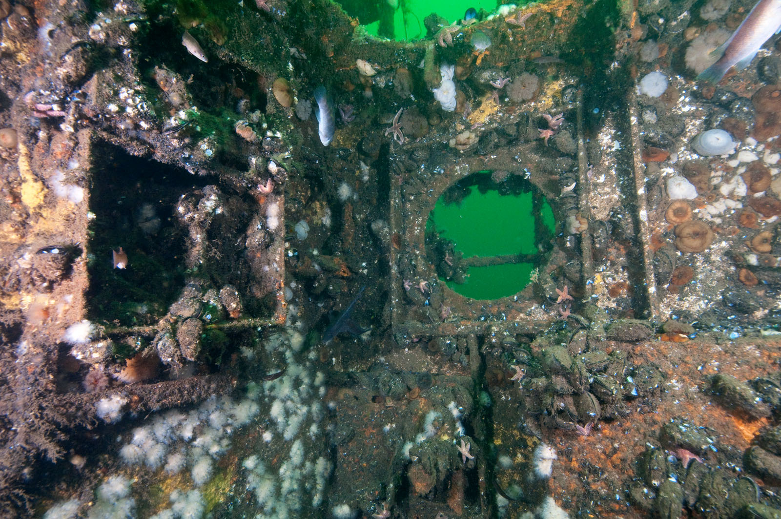 Views of the interior of the McGurr tugboat, sunk on Tuesday, September 12, 2000. The tug is 85' long and was built in 1951 in Cohoes, NY and named the Edward Matton. She was also called the Patrick McHugh. The tug was sponsored by Ocean Wreck Divers in memory of Charles J. McGurr, Jr. She lies in 80' of water on the Axel Carlson Reef in New Jersey, USA. This canal tugboat has a pilot house that could be raised or lowered.