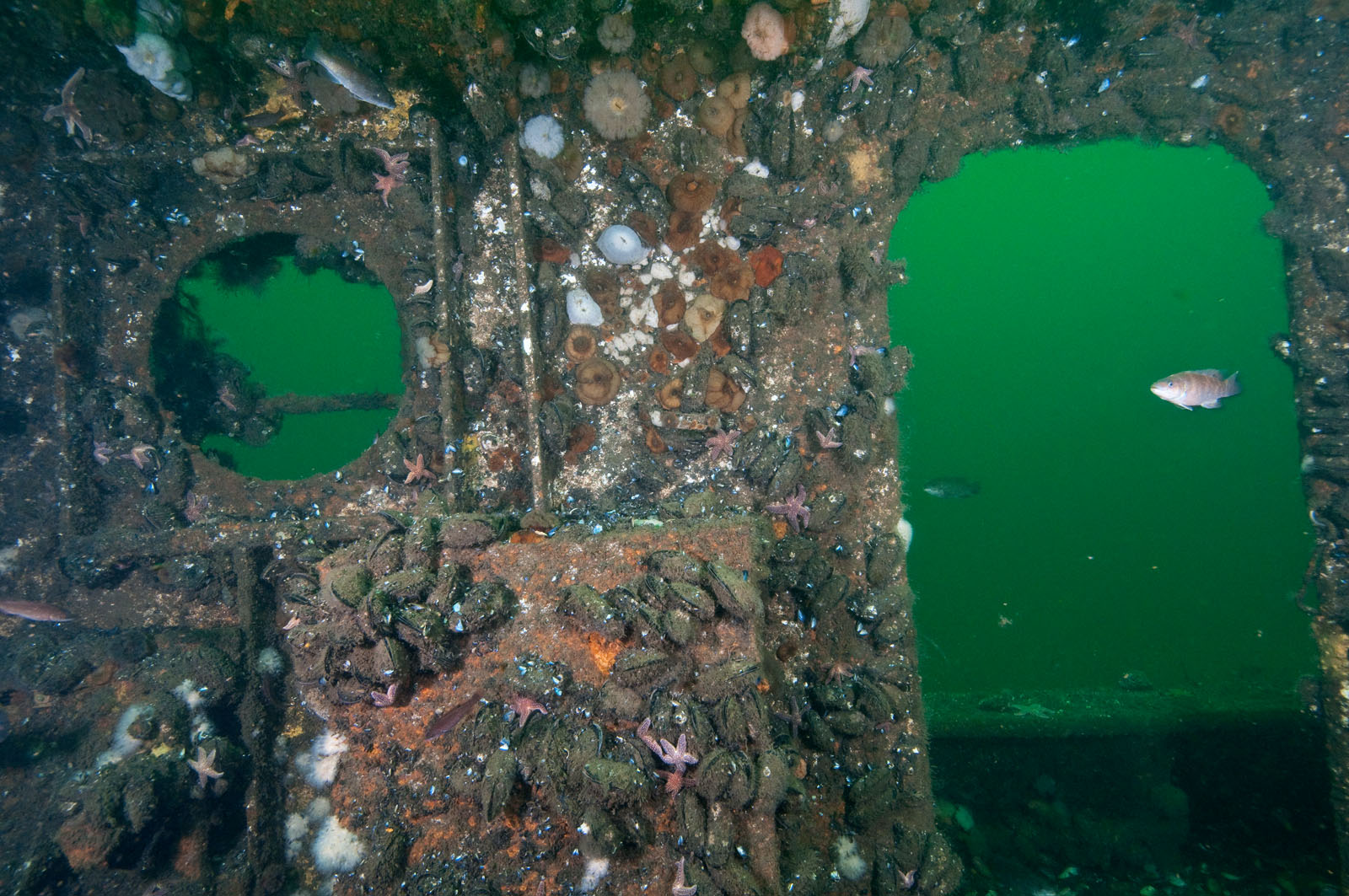 Views of the interior of the McGurr tugboat, sunk on Tuesday, September 12, 2000. The tug is 85' long and was built in 1951 in Cohoes, NY and named the Edward Matton. She was also called the Patrick McHugh. The tug was sponsored by Ocean Wreck Divers in memory of Charles J. McGurr, Jr. She lies in 80' of water on the Axel Carlson Reef in New Jersey, USA. This canal tugboat has a pilot house that could be raised or lowered.