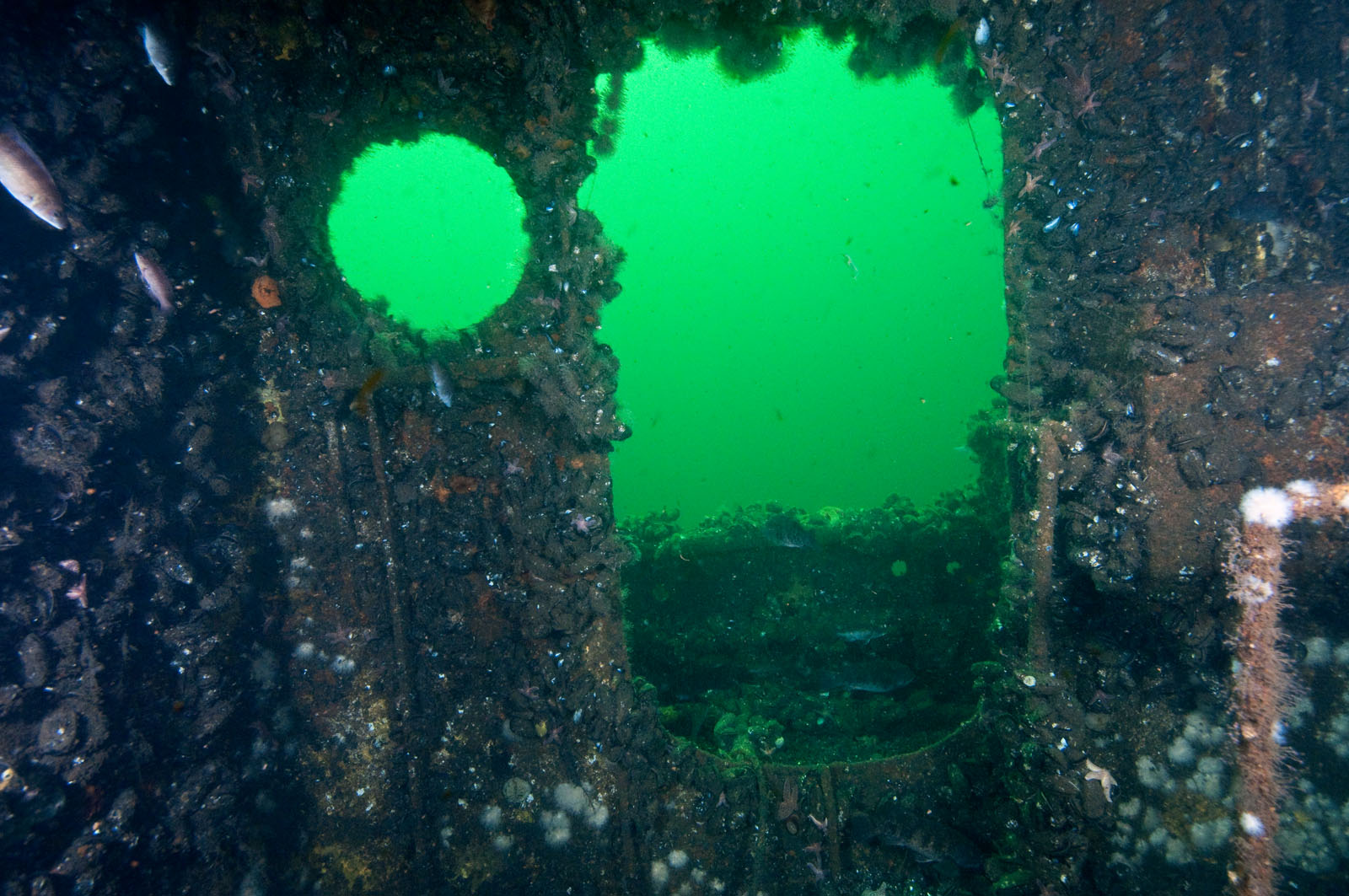 Views of the interior of the McGurr tugboat, sunk on Tuesday, September 12, 2000. The tug is 85' long and was built in 1951 in Cohoes, NY and named the Edward Matton. She was also called the Patrick McHugh. The tug was sponsored by Ocean Wreck Divers in memory of Charles J. McGurr, Jr. She lies in 80' of water on the Axel Carlson Reef in New Jersey, USA. This canal tugboat has a pilot house that could be raised or lowered.