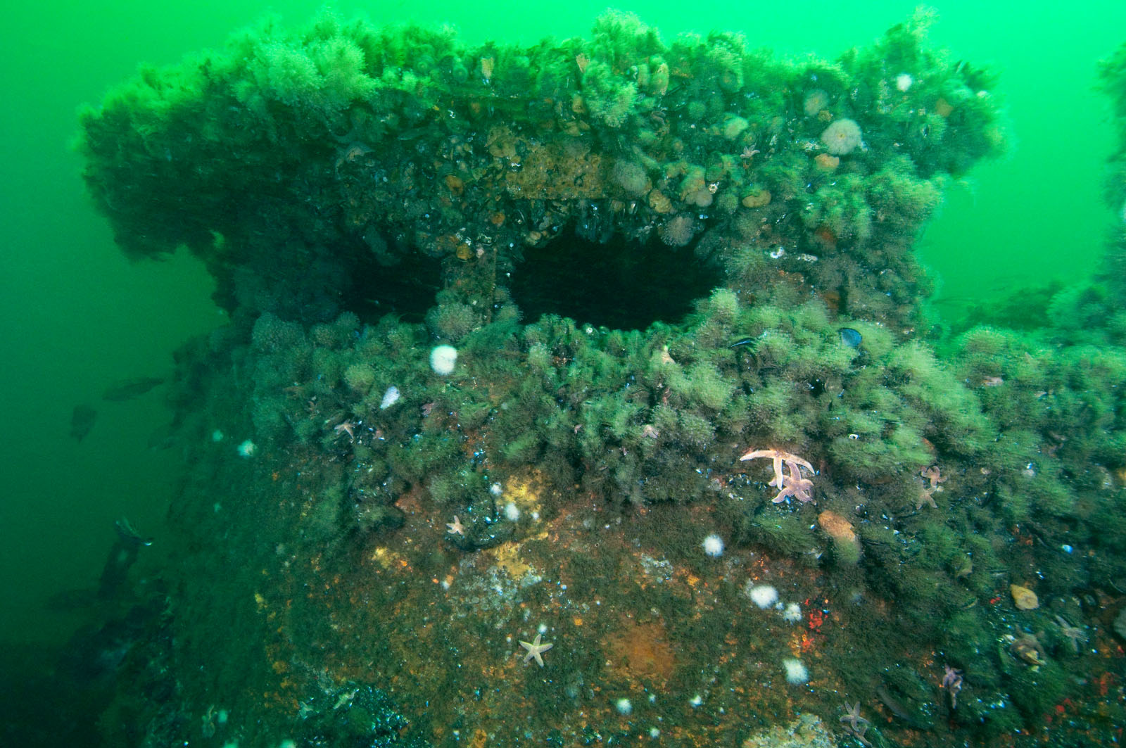 The pilot house on the McGurr tugboat, sunk on Tuesday, September 12, 2000. The tug is 85' long and was built in 1951 in Cohoes, NY and named the Edward Matton. She was also called the Patrick McHugh. The tug was sponsored by Ocean Wreck Divers in memory of Charles J. McGurr, Jr. She lies in 80' of water on the Axel Carlson Reef in New Jersey, USA. This canal tugboat has a pilot house that could be raised or lowered.