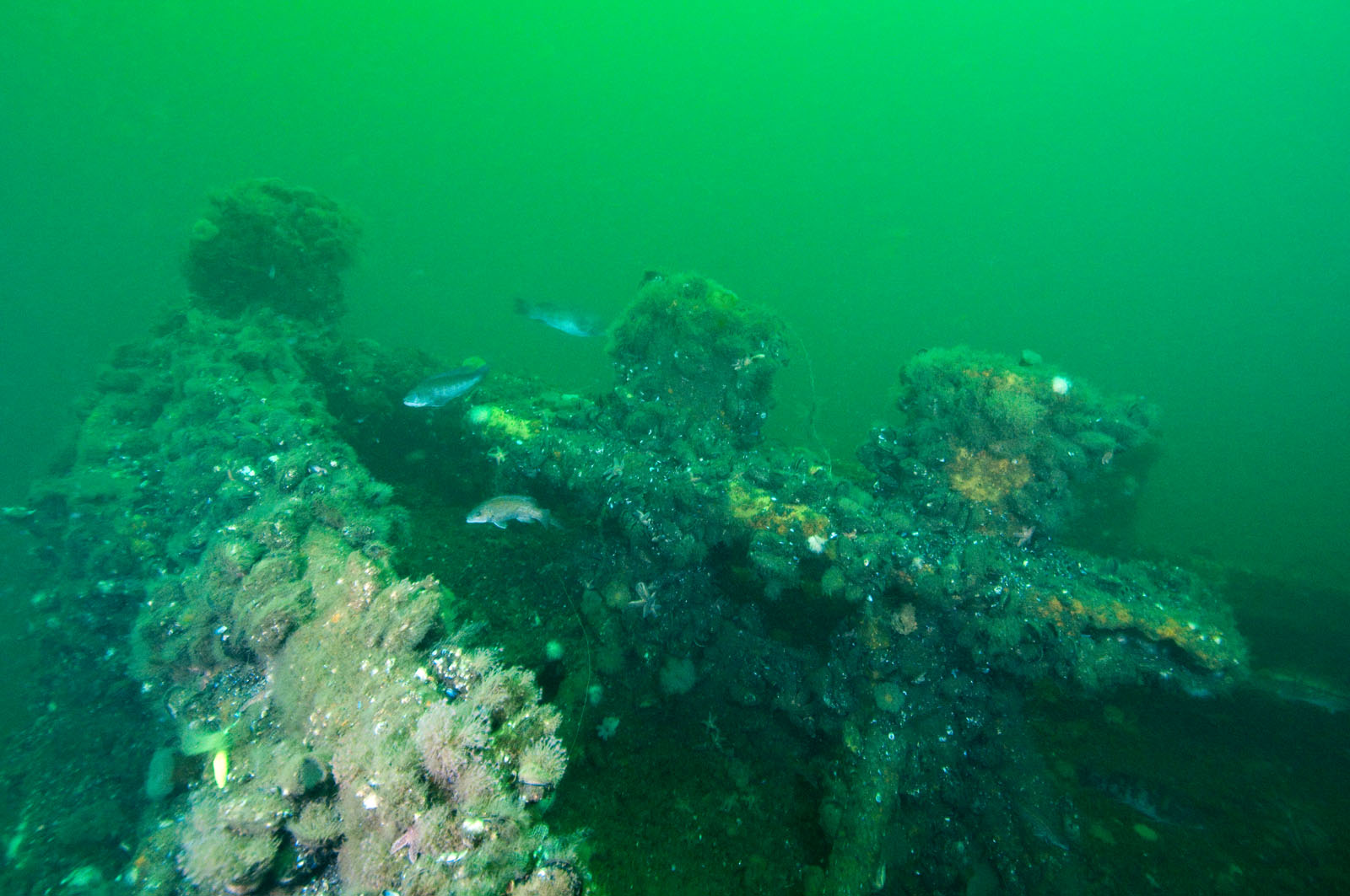 The blue mussel covered bow of the McGurr tugboat, sunk on Tuesday, September 12, 2000. The tug is 85' long and was built in 1951 in Cohoes, NY and named the Edward Matton. She was also called the Patrick McHugh. The tug was sponsored by Ocean Wreck Divers in memory of Charles J. McGurr, Jr. She lies in 80' of water on the Axel Carlson Reef in New Jersey, USA. This canal tugboat has a pilot house that could be raised or lowered.