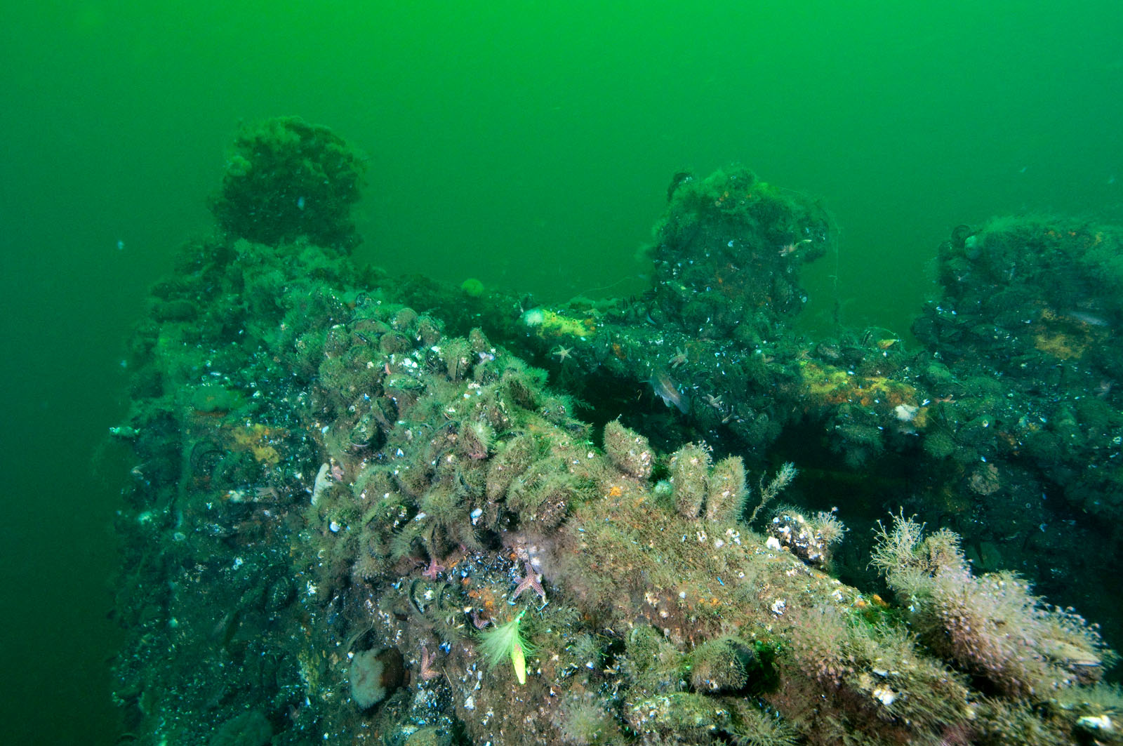 The blue mussel covered bow of the McGurr tugboat, sunk on Tuesday, September 12, 2000. The tug is 85' long and was built in 1951 in Cohoes, NY and named the Edward Matton. She was also called the Patrick McHugh. The tug was sponsored by Ocean Wreck Divers in memory of Charles J. McGurr, Jr. She lies in 80' of water on the Axel Carlson Reef in New Jersey, USA. This canal tugboat has a pilot house that could be raised or lowered.