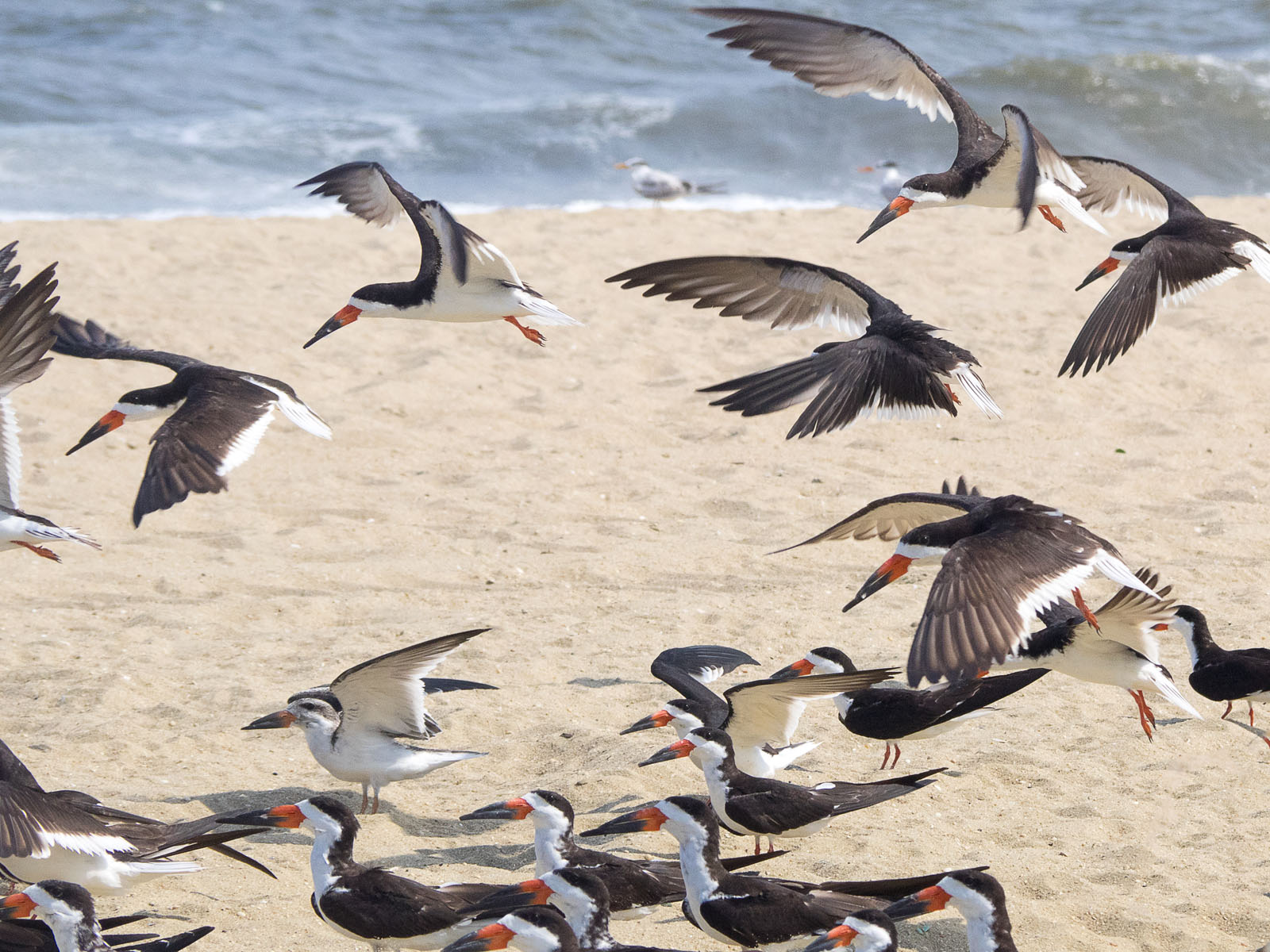 Black skimmers, Rynchops niger, flock on the beach in Belmar, New Jersey, USA at the edge of the Atlantic Ocean prior to tropical storm, Hermine.