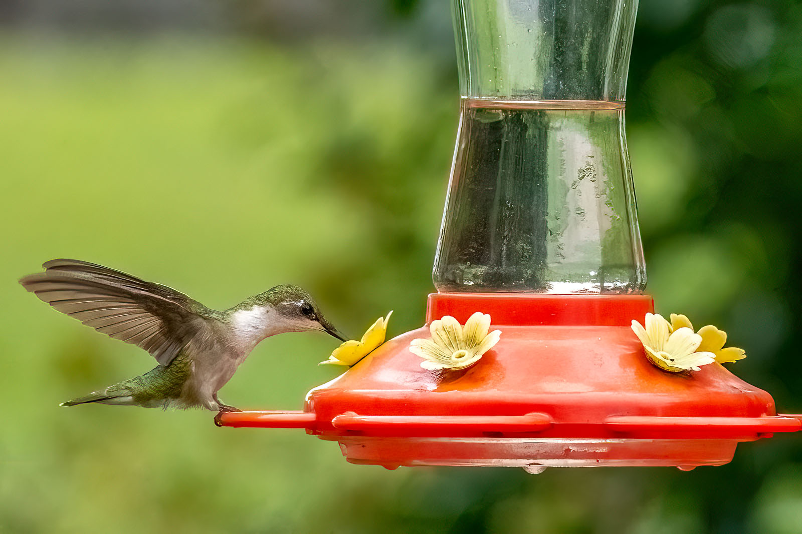 A female ruby-throated hummingbird at a feeder in a backyard in Brick, NJ.