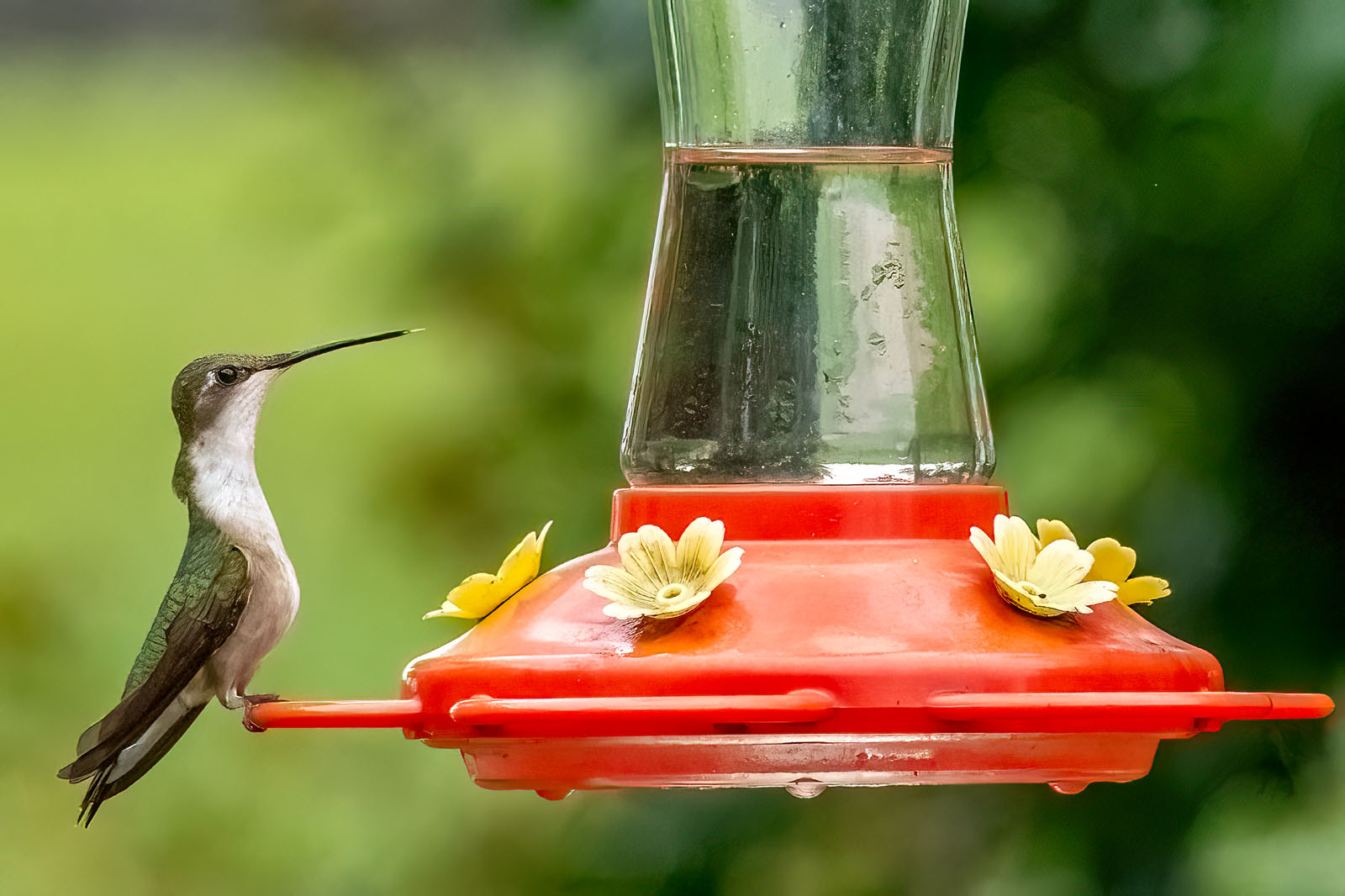 A female ruby-throated hummingbird at a feeder in a backyard in Brick, NJ.