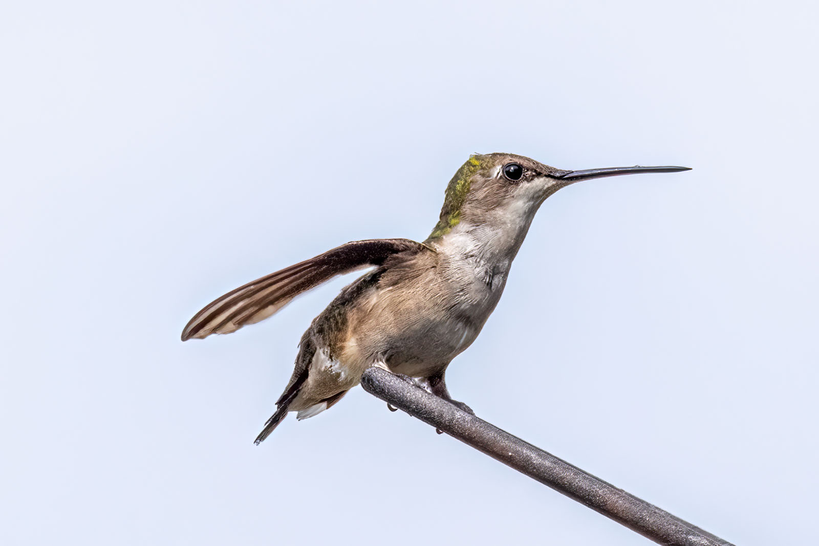 A female ruby-throated hummingbird at a feeder in a backyard in Brick, NJ.
