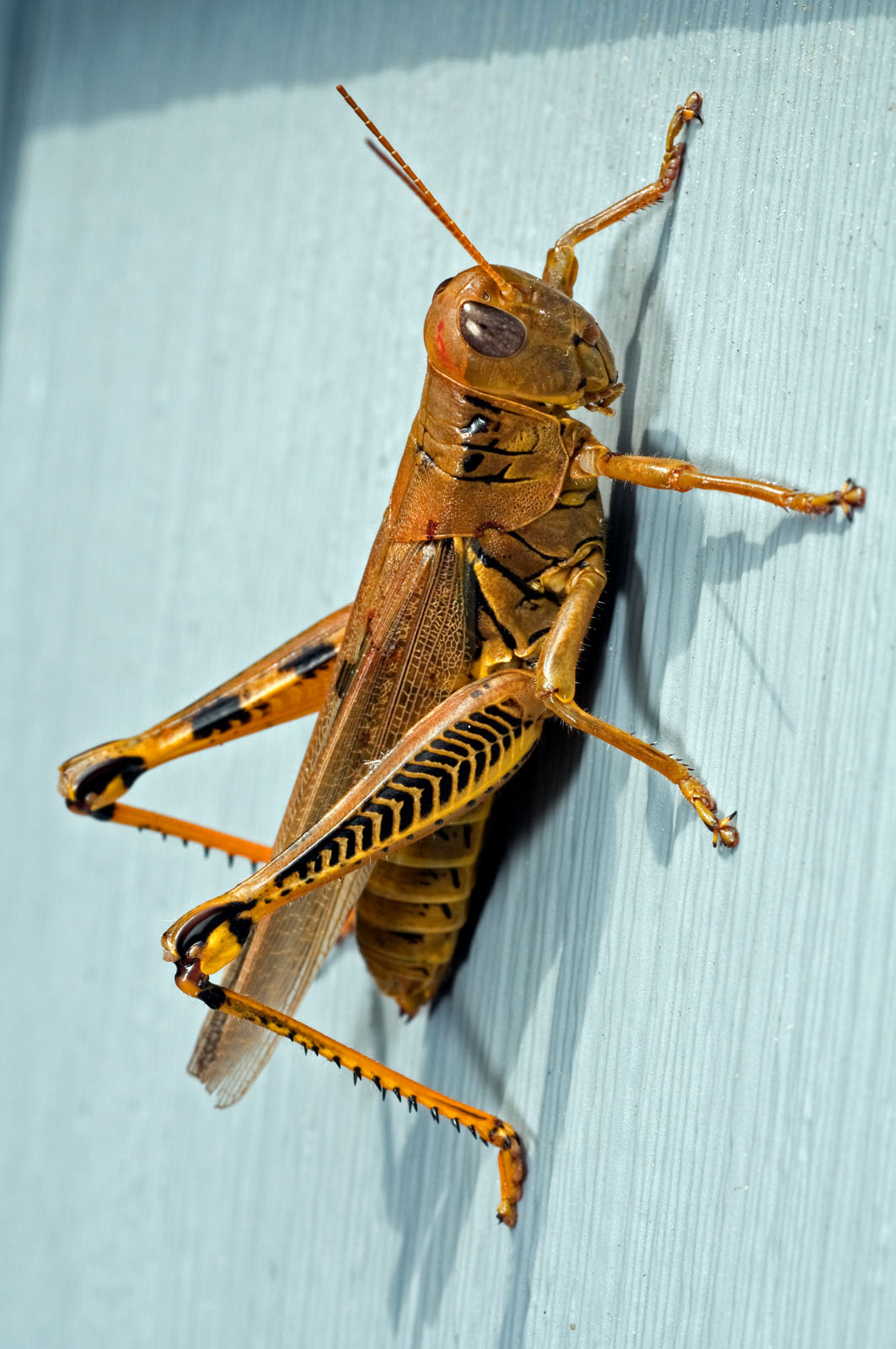 A differential grasshopper, Melanopplus differentialis, on a house in Brick, New Jersey, USA. This species of grasshopper reaches a length of 30-45 mm and are found throughout North America. They are a common, nonmigrating but very destructive grasshopper found feeding on grass and forage crops.