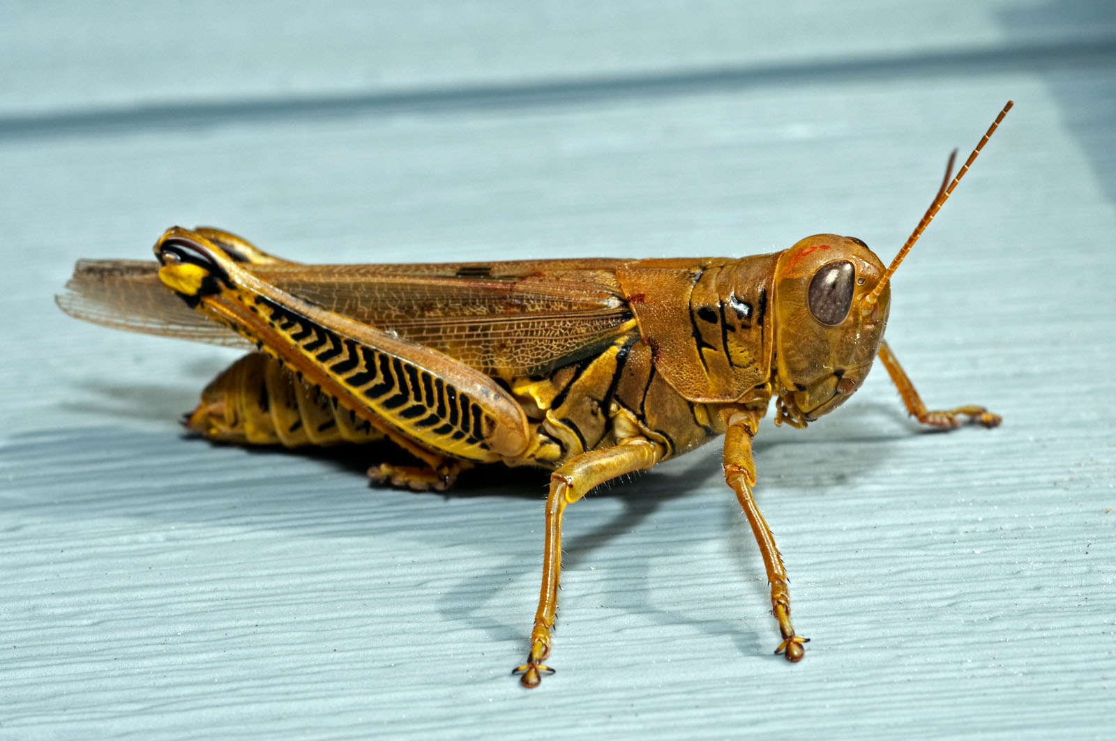 A differential grasshopper, Melanopplus differentialis, on a house in Brick, New Jersey, USA. This species of grasshopper reaches a length of 30-45 mm and are found throughout North America. They are a common, nonmigrating but very destructive grasshopper found feeding on grass and forage crops.