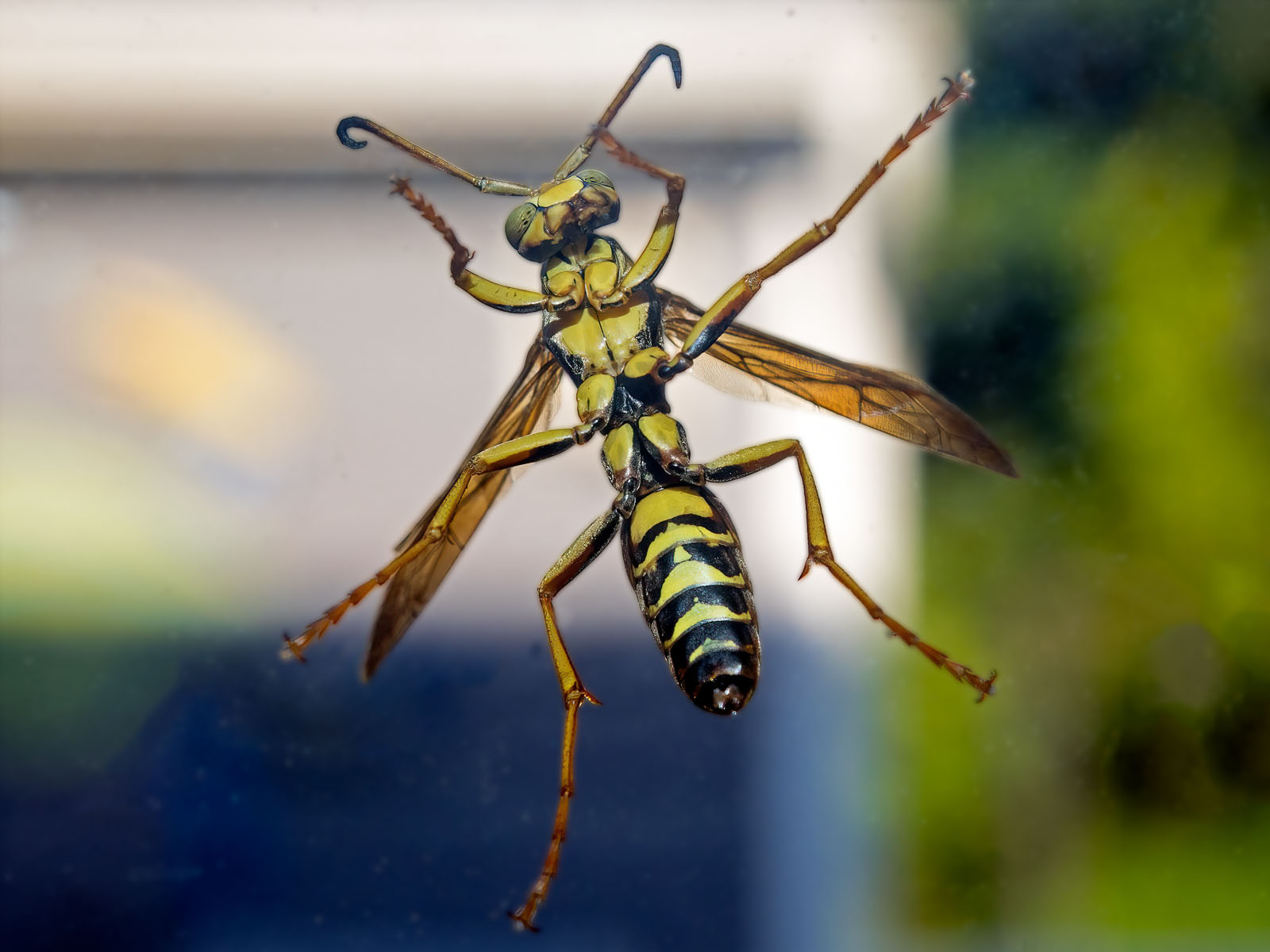 A paper wasp, Polistes species, on a sliding glass door in Brick, New Jersey, USA.