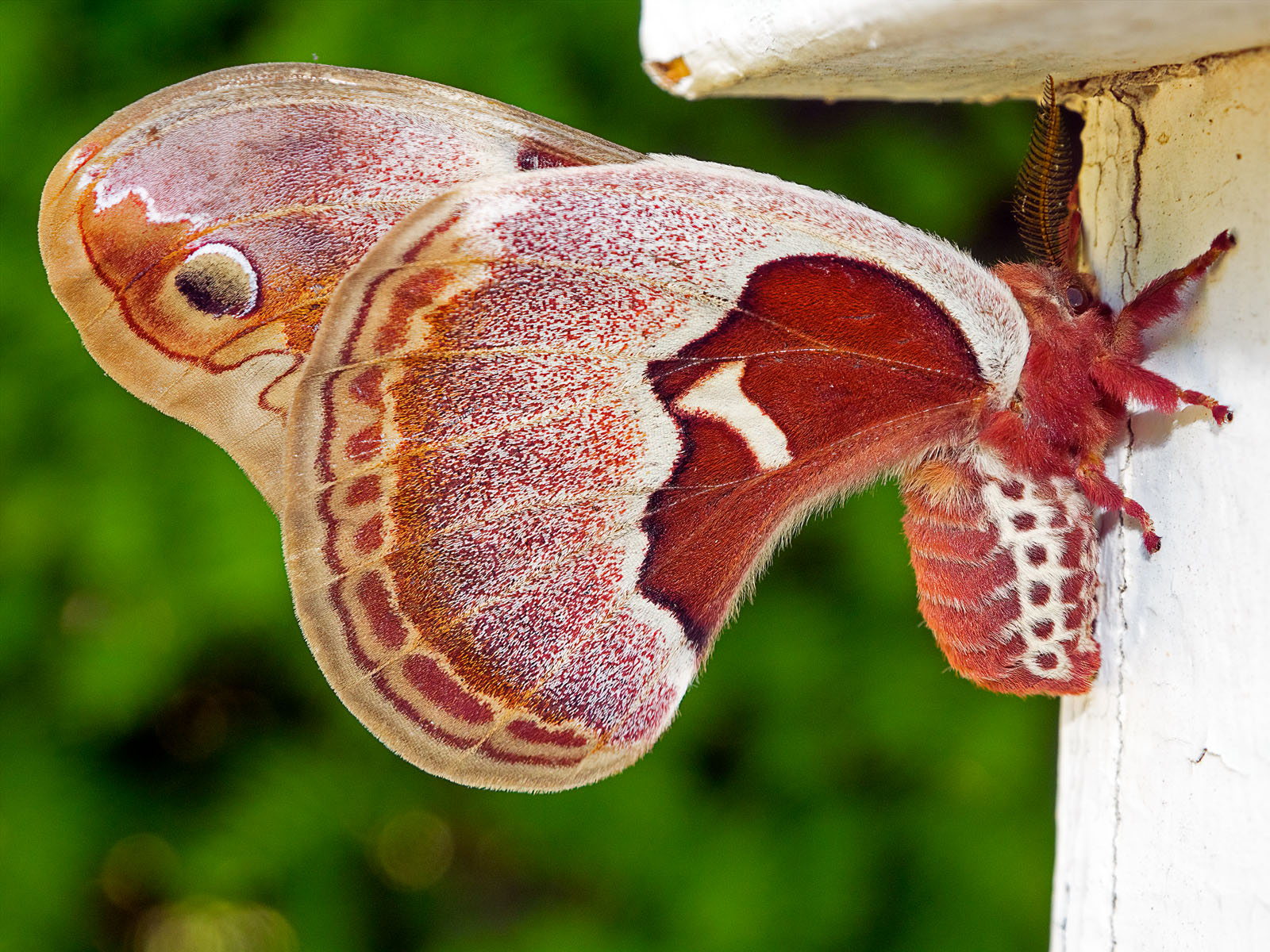 A female Promethea silkmoth, Callosamia promethea, photographed in a backyard in Wall, New Jersey, USA.