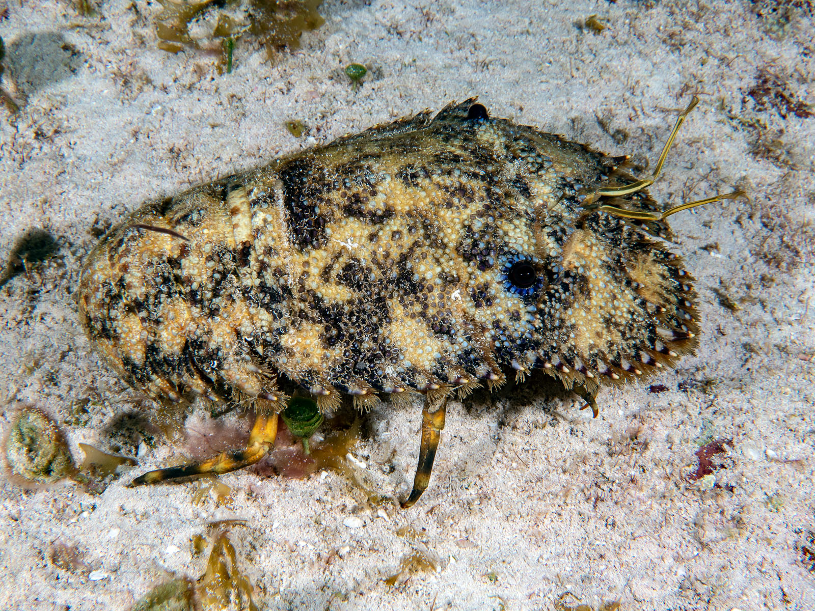 A sculptured slipper lobster, Parribacus antarcticus, in the waters off Cozumel, Mexico.