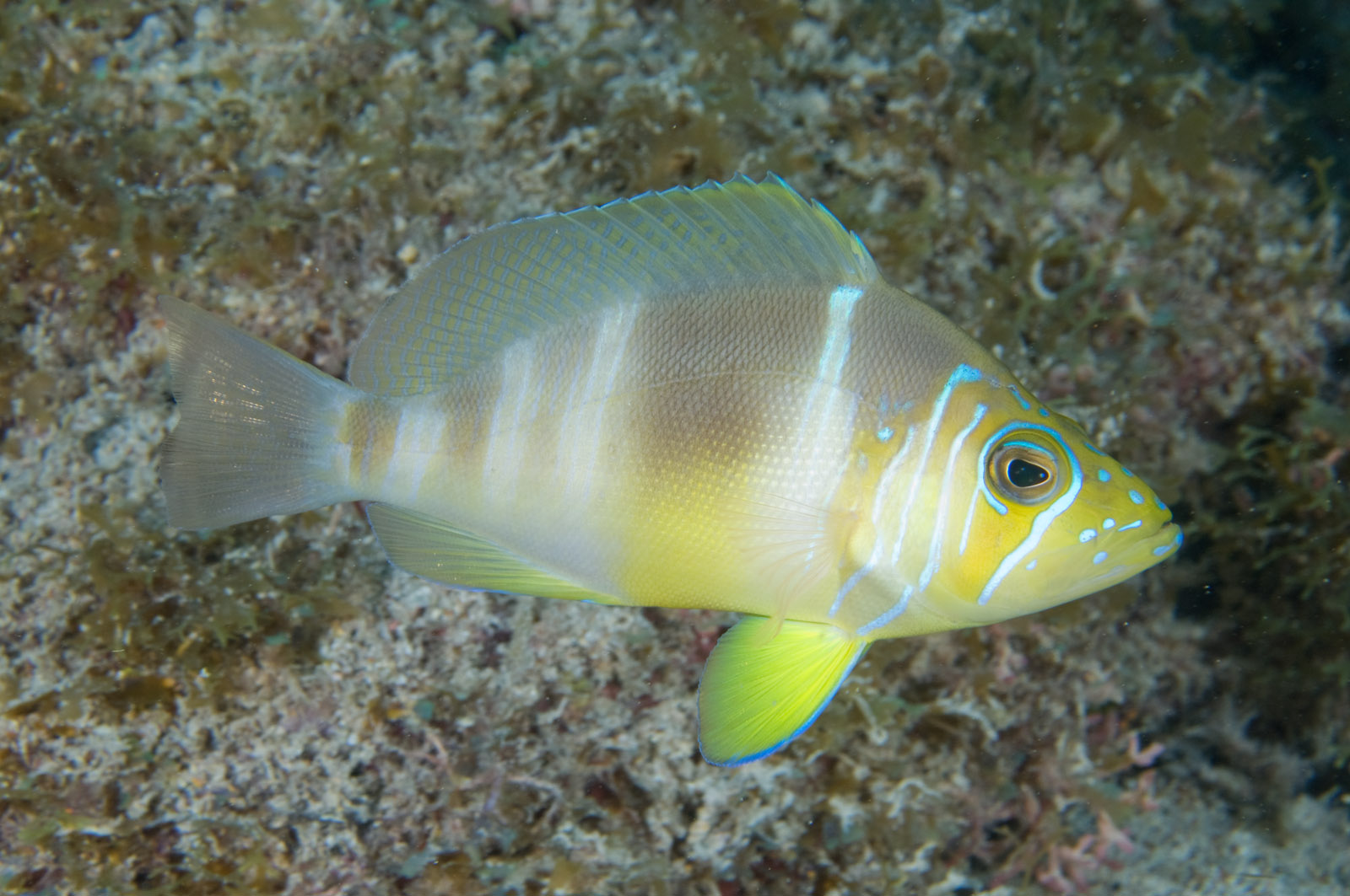 A barred hamlet, Hypoplectrus puella, on the Benwood Wreck which lies in 30' - 55' of water within the Florida Keys National Marine Sanctuary off Key Largo, FL, USA. This 285-foot 1910 English-built ship sailed a crew of 38 with 12 rifles and one four-inch gun and sunk in 1942. She lies between French Reef and the Dixie Shoals and is marked by a spar buoy and four mooring buoys.