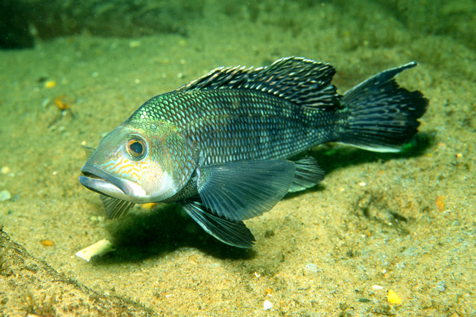 A black sea bass, Centropristis striata, photographed on a shipwreck/artificial reef in the Atlantic Ocean off the coast of New Jersey, USA.