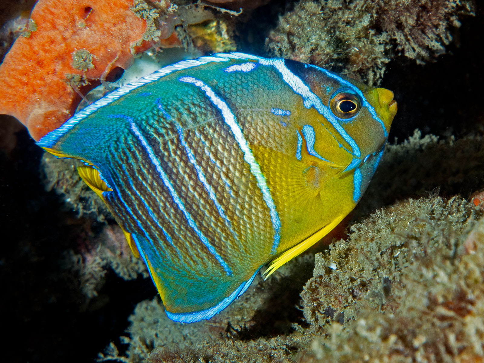 A juvenile blue angelfish, Holacanthus bermudens, at the Blue Heron Bridge at Phil Foster State Park in Riviera Beach, Florida, USA.