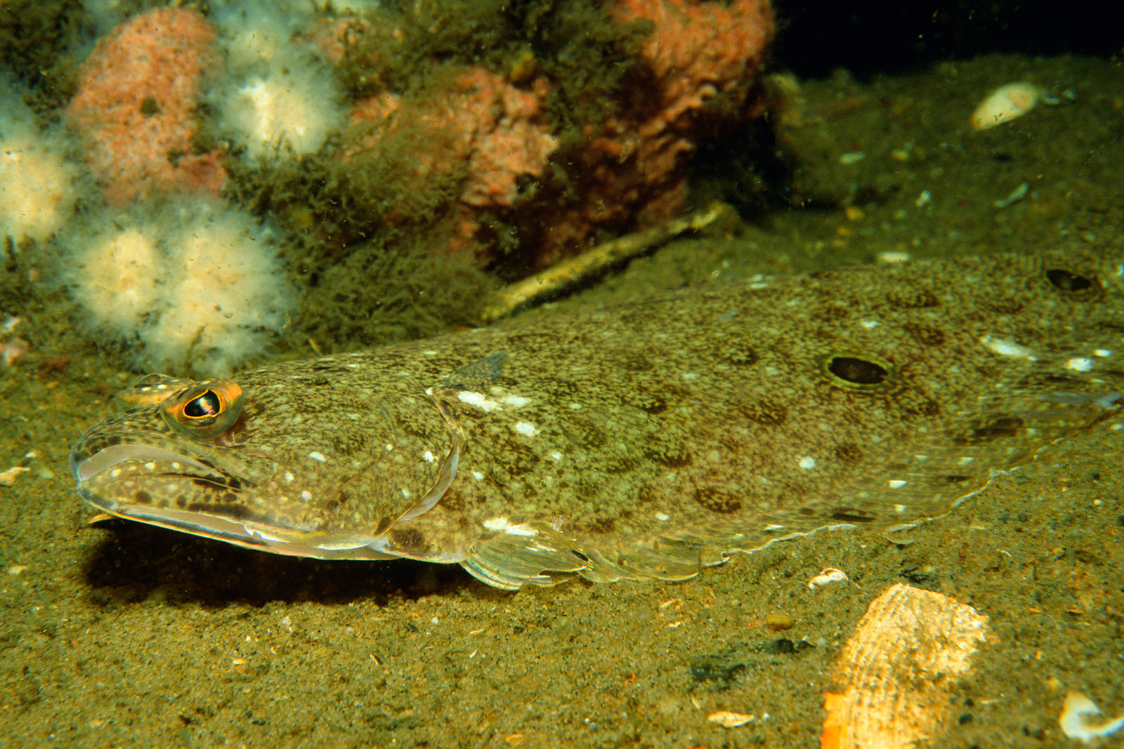 Fourspot flounder, Paralichthys oblongu, photographed on a shipwreck off the coast of New Jersey, USA. They are identified by the four large, oblong, and very conspicuous black eye spots edged with pale pinkish, two of them situated at each margin of the body.