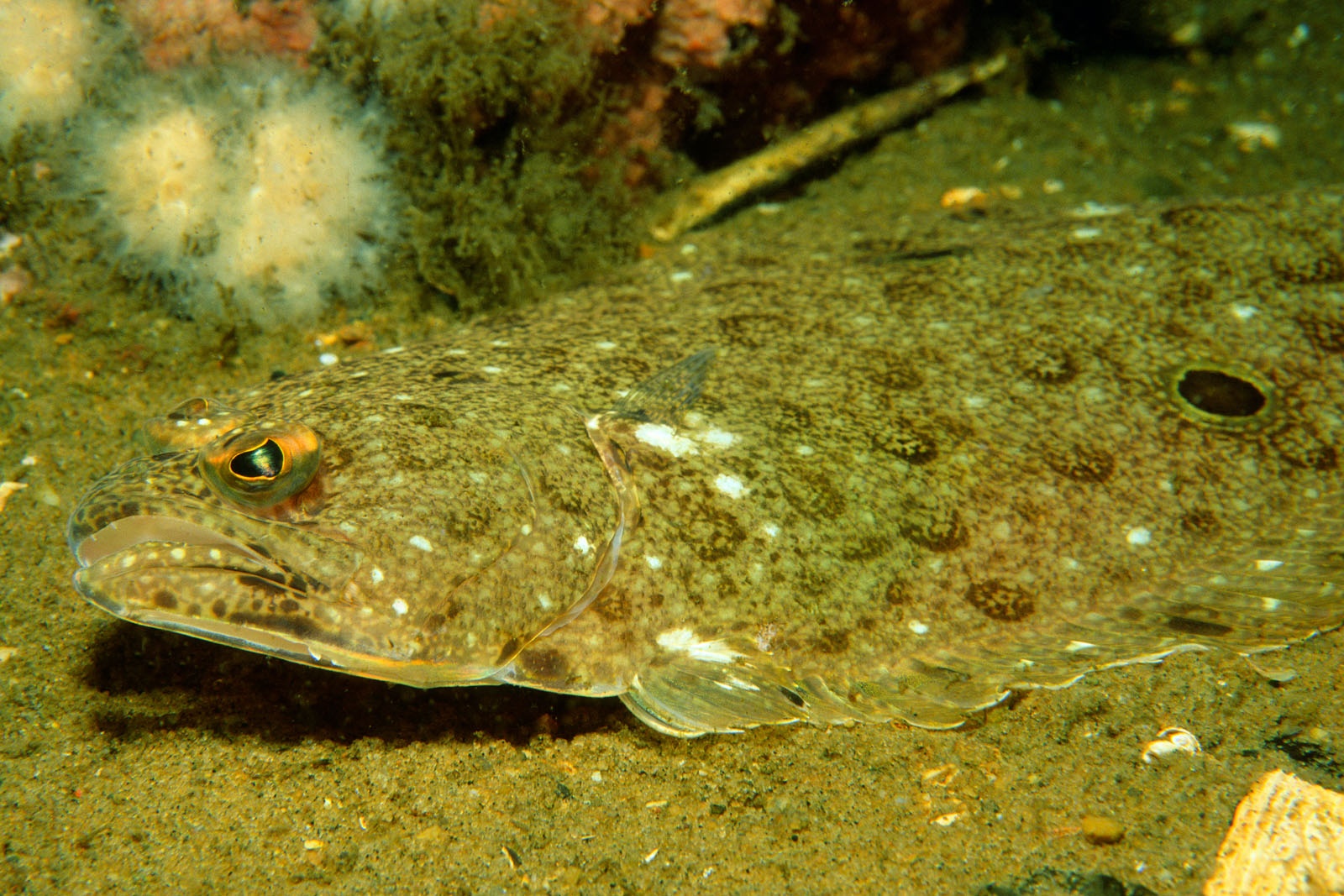 Fourspot flounder, Paralichthys oblongu, photographed on a shipwreck off the coast of New Jersey, USA. They are identified by the four large, oblong, and very conspicuous black eye spots edged with pale pinkish, two of them situated at each margin of the body.