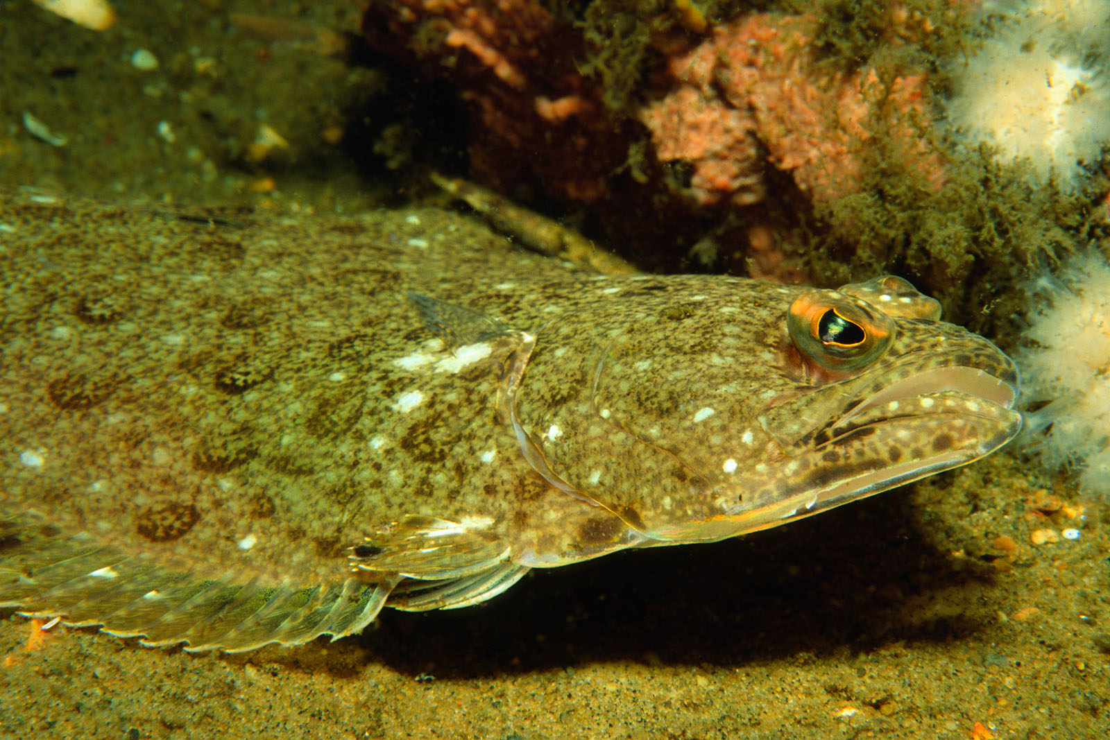Fourspot flounder, Paralichthys oblongu, photographed on a shipwreck off the coast of New Jersey, USA. They are identified by the four large, oblong, and very conspicuous black eye spots edged with pale pinkish, two of them situated at each margin of the body.