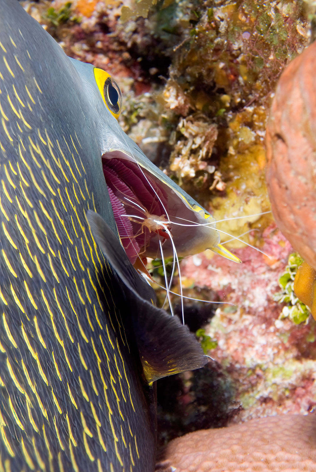 A French angelfish, Pomacanthus paru, being cleaned by a scarlet skunk cleaning shrimp, Lysmata amboinensis, at Hawksbill Reef in the northern Bahamas.