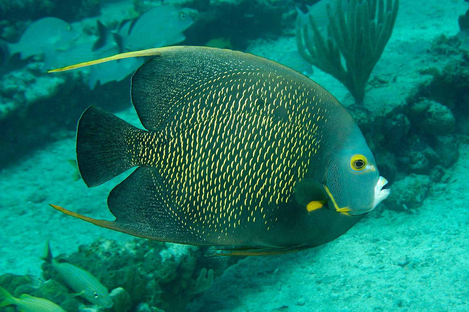 A French angelfish, Pomacanthus paru, on the Sugar Wreck, north of Grand Bahama Island in the northwestern Bahamas.