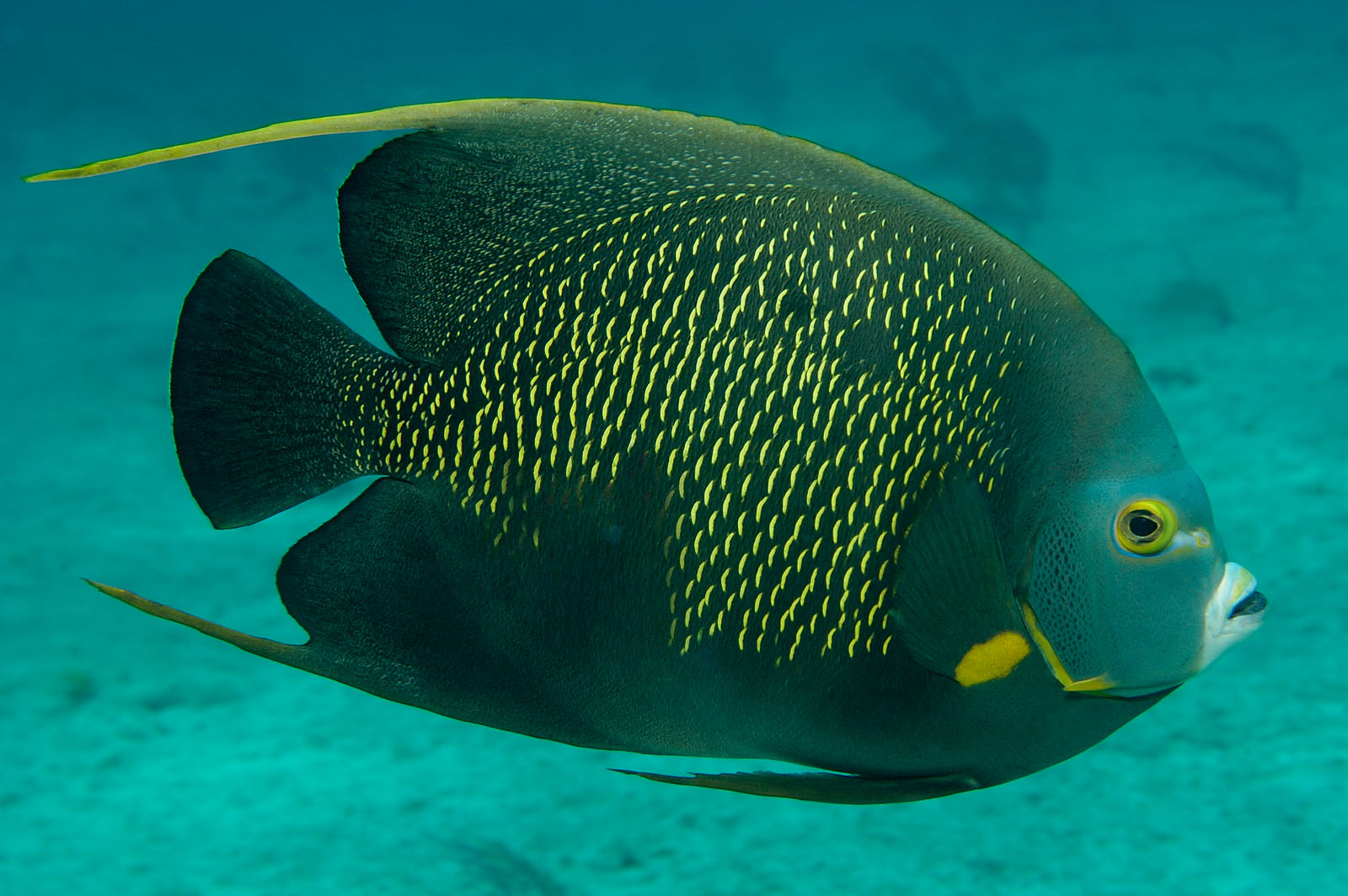 A French angelfish, Pomacanthus paru, on the Sugar Wreck, north of Grand Bahama Island in the northwestern Bahamas.