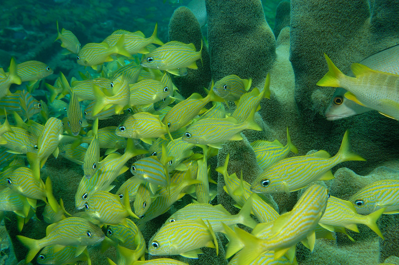 Bluestriped grunts, Haemulon sciurus, on the Sugar Wreck, north of Grand Bahama Island in the northwestern Bahamas.