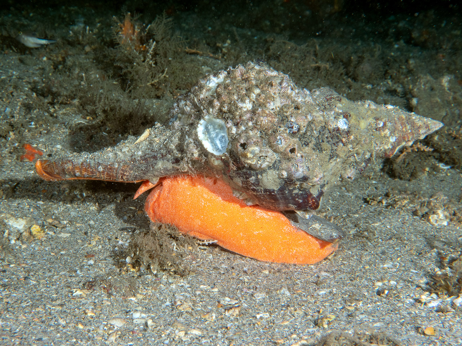 A Florida horse conch, Pleuroploca gigantea, at the Blue Heron Bridge at Phil Foster State Park in Riviera Beach, Florida, USA.