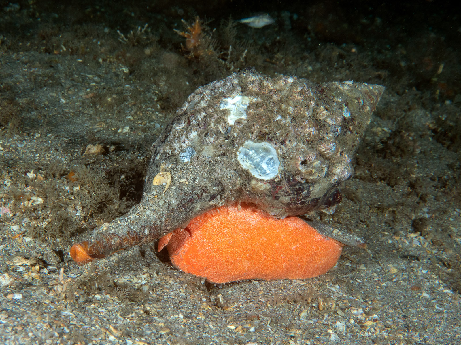 A Florida horse conch, Pleuroploca gigantea, at the Blue Heron Bridge at Phil Foster State Park in Riviera Beach, Florida, USA.