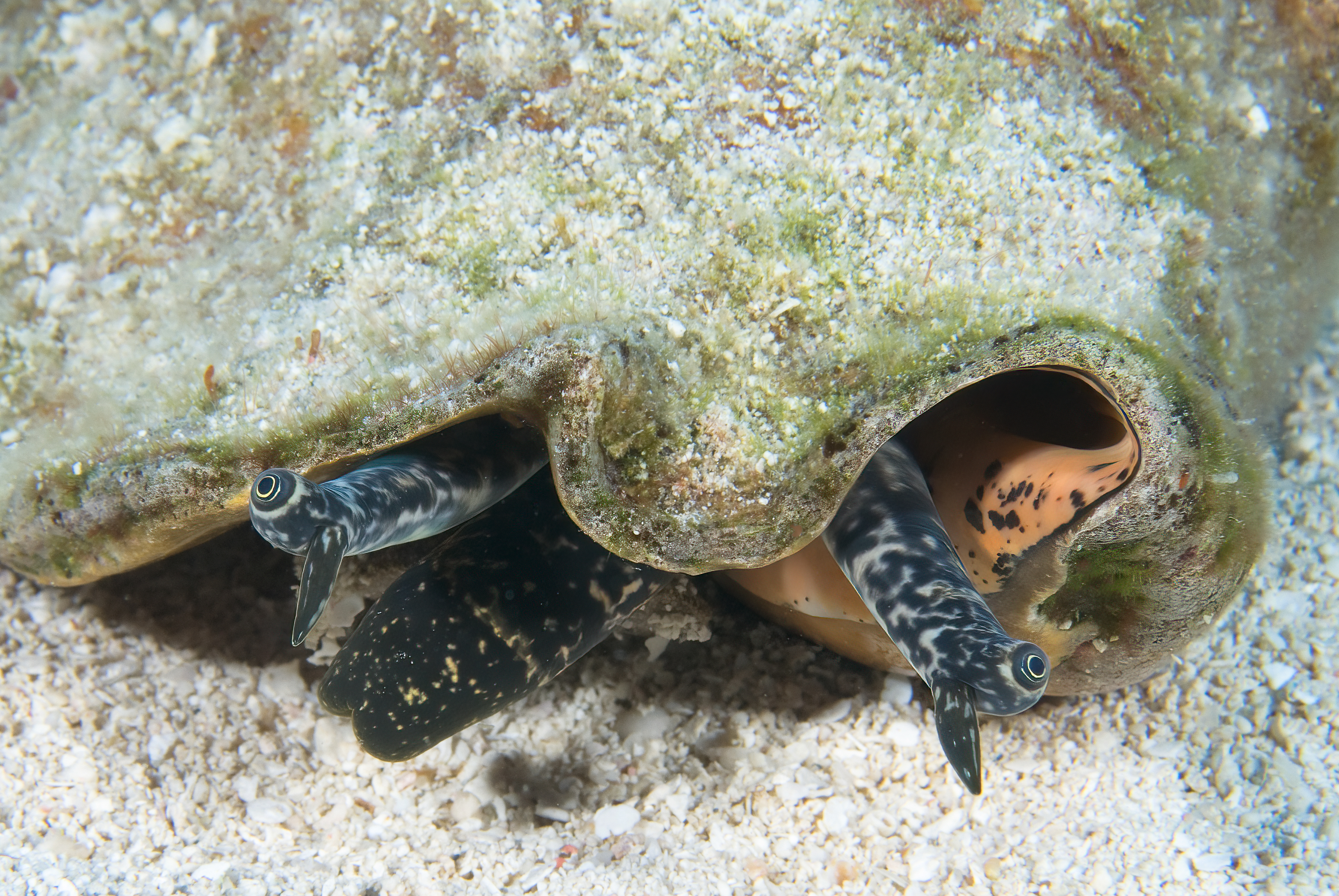 A closeup of a queen conch, Strombus gigas, at Scoto's Reef in the northern Bahamas.