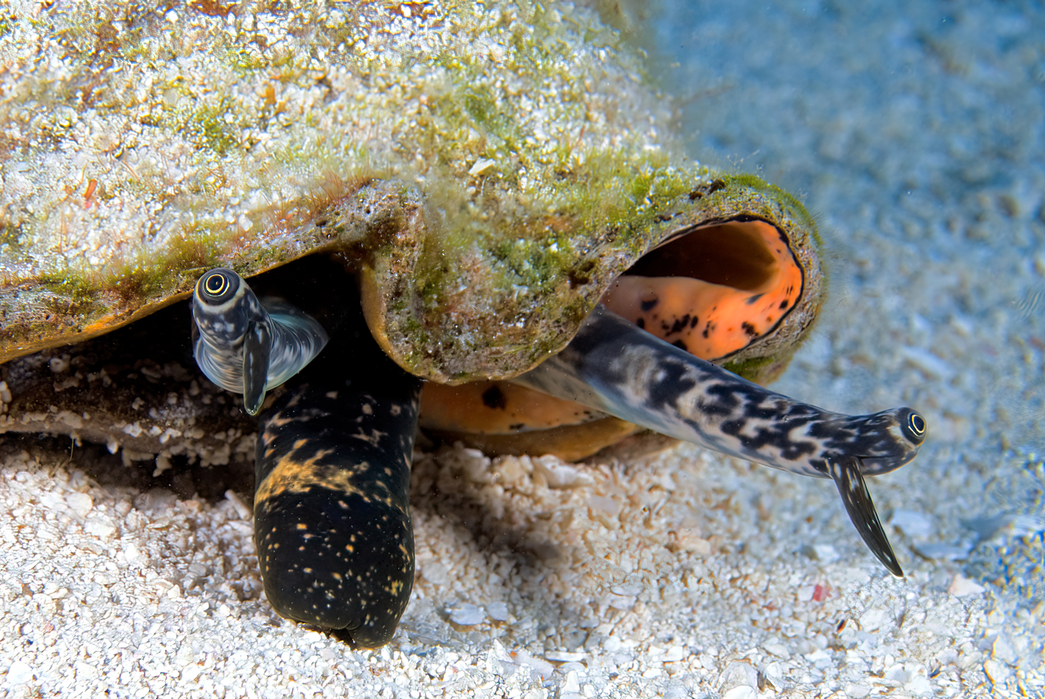 A closeup of a queen conch, Strombus gigas, at Scoto's Reef in the northern Bahamas.
