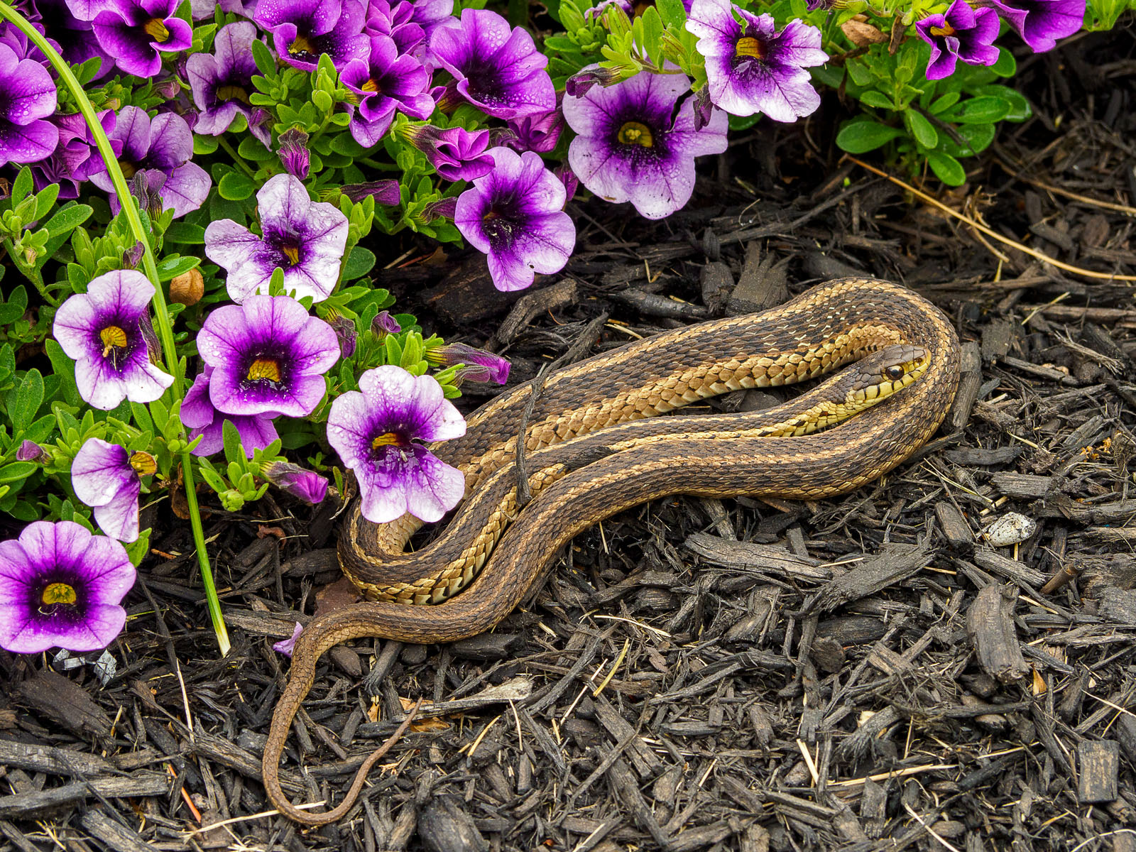 An eastern garter snake, Thamnophis sirtalis sirtalis, in a flower bed in Brick, NJ, USA.