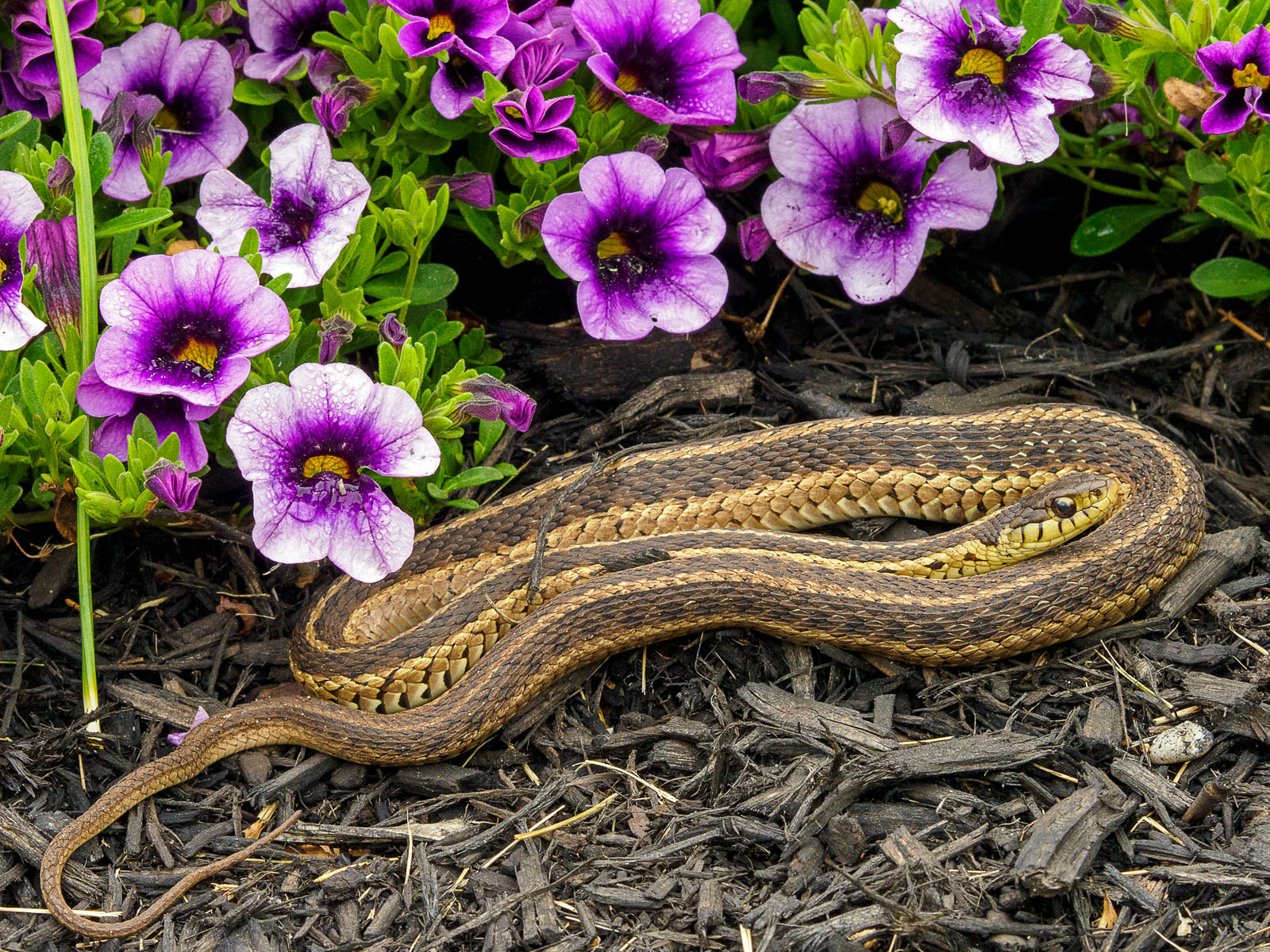An eastern garter snake, Thamnophis sirtalis sirtalis, in a flower bed in Brick, NJ, USA.