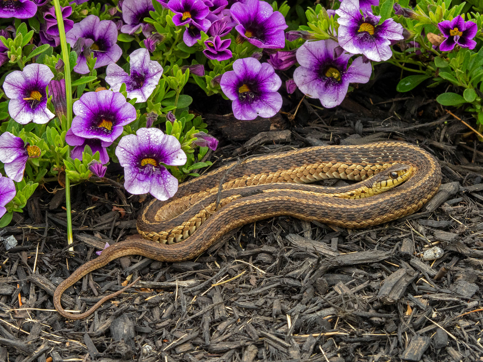 An eastern garter snake, Thamnophis sirtalis sirtalis, in a flower bed in Brick, NJ, USA.