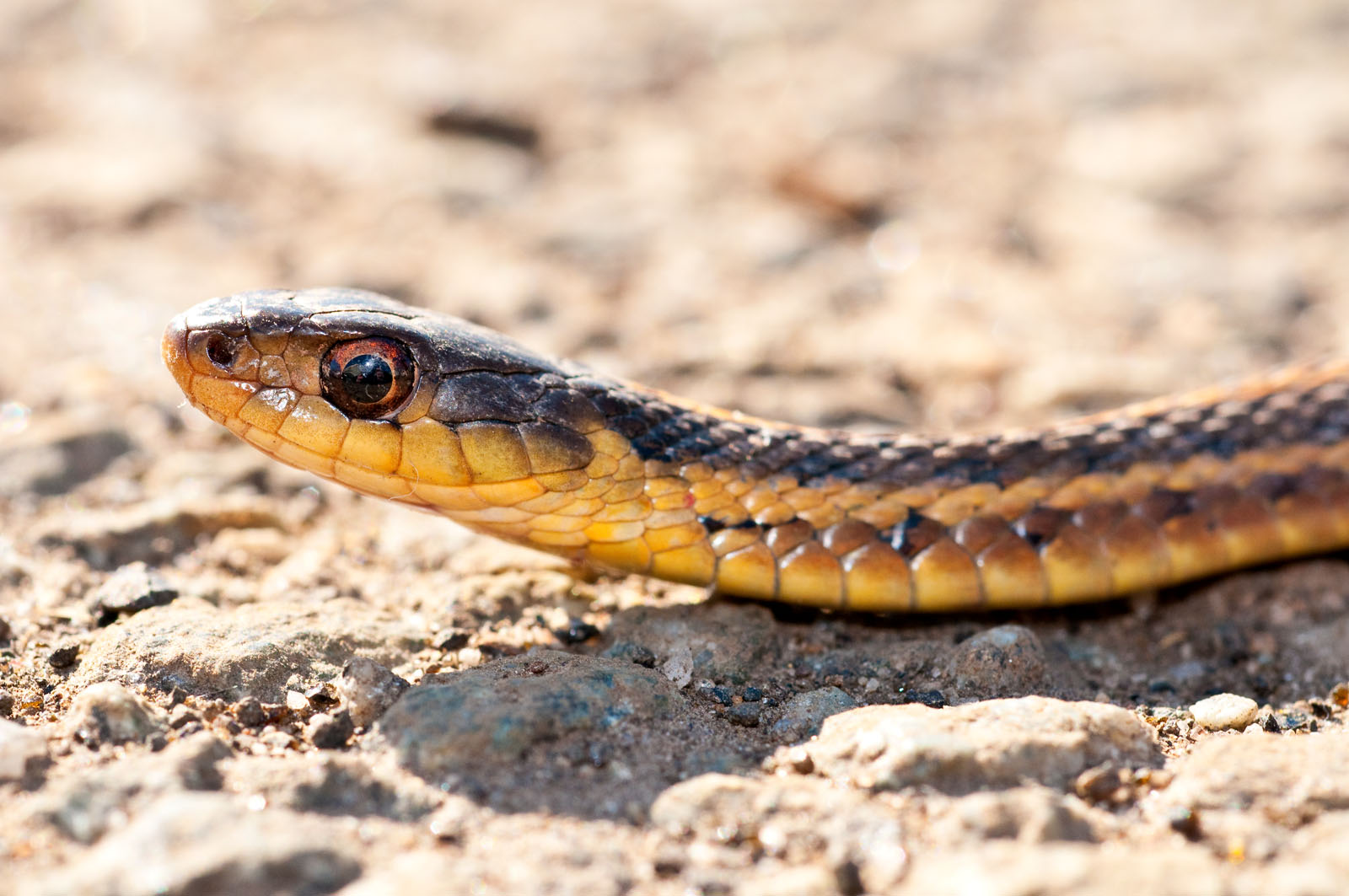 A common garter snake, Thamnophis sirtalis, that is approximately 15" long photographed at the end of Cutters Dock Road in Woodbridge, New Jersey, USA.