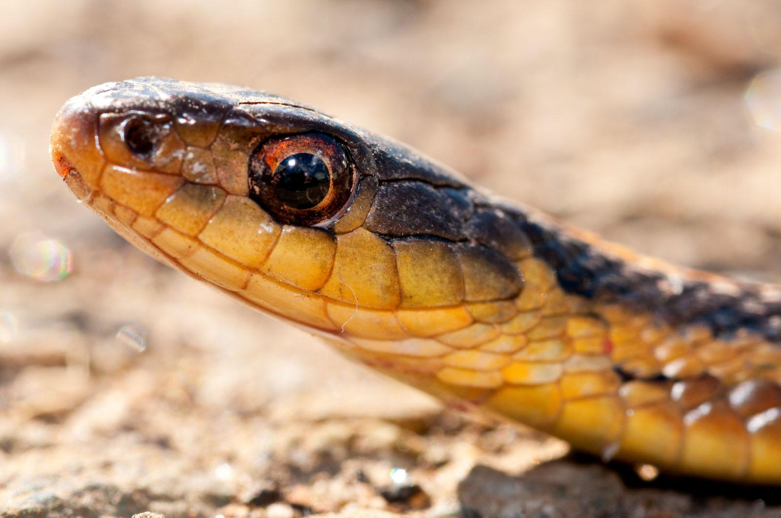 A common garter snake, Thamnophis sirtalis, that is approximately 15" long photographed at the end of Cutters Dock Road in Woodbridge, New Jersey, USA.