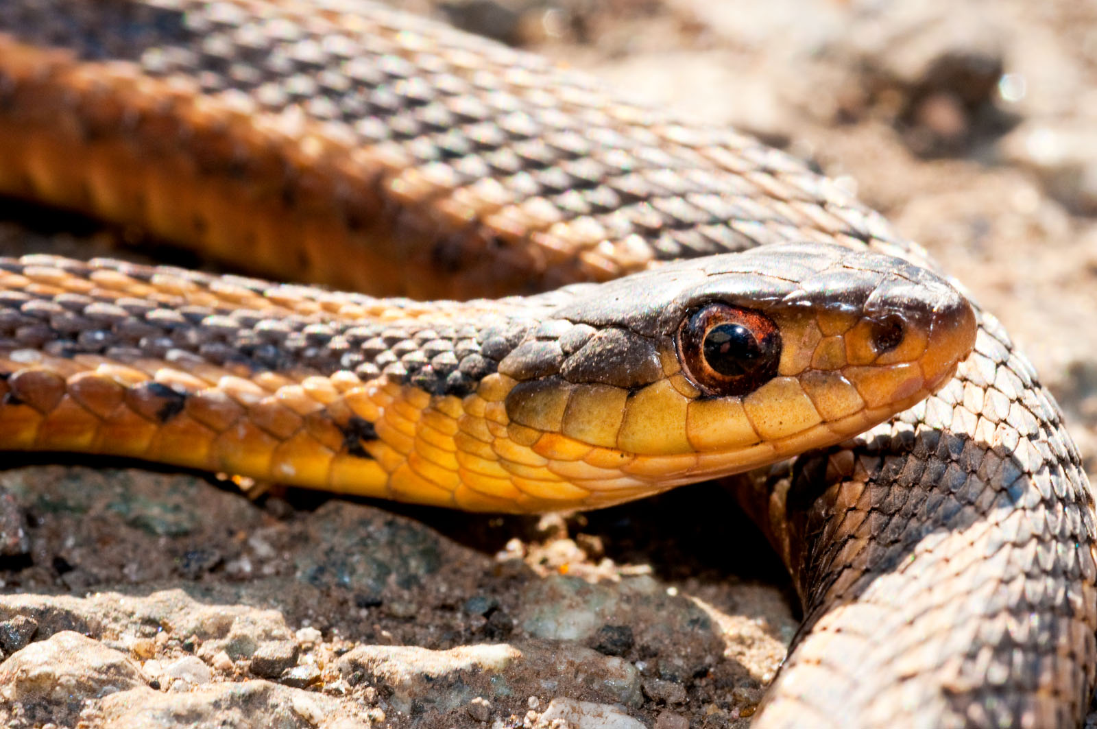 A common garter snake, Thamnophis sirtalis, that is approximately 15" long photographed at the end of Cutters Dock Road in Woodbridge, New Jersey, USA.