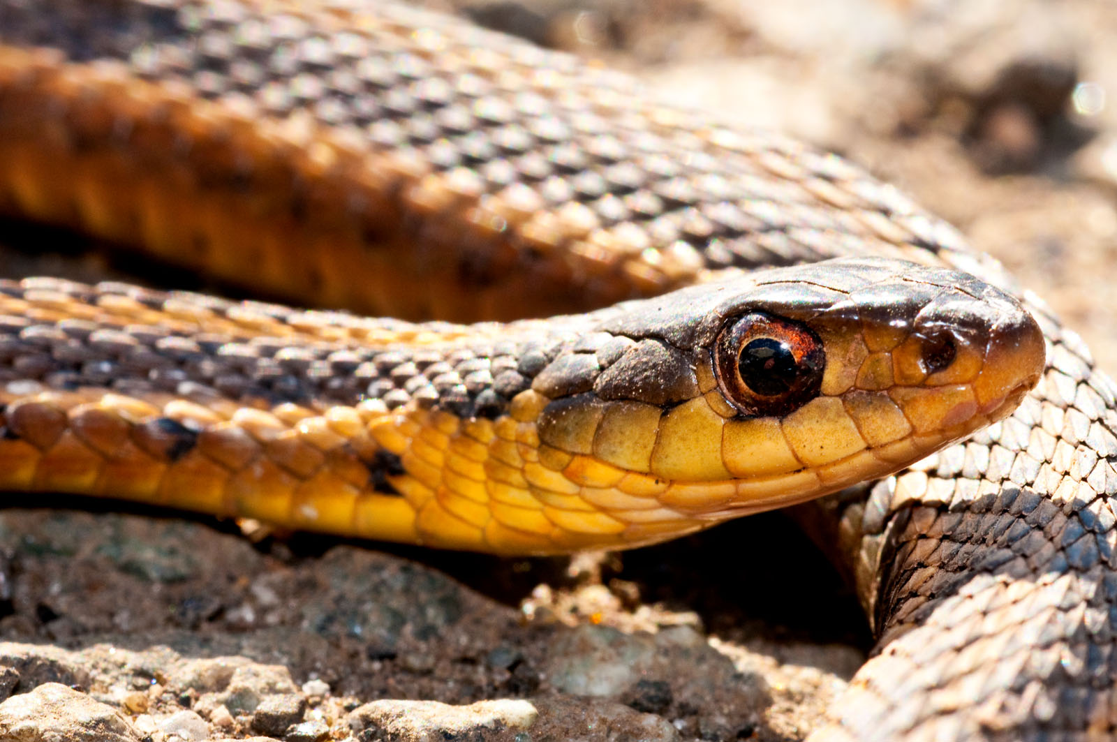 A common garter snake, Thamnophis sirtalis, that is approximately 15" long photographed at the end of Cutters Dock Road in Woodbridge, New Jersey, USA.