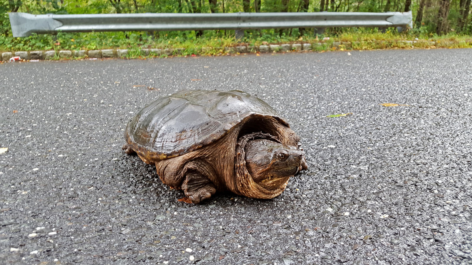 A common snapping turtle, Chelydra serpentina, crossing a road in Wall, New Jersey, USA.